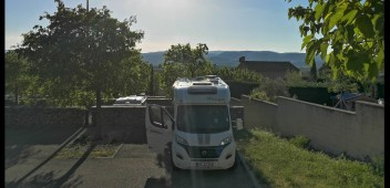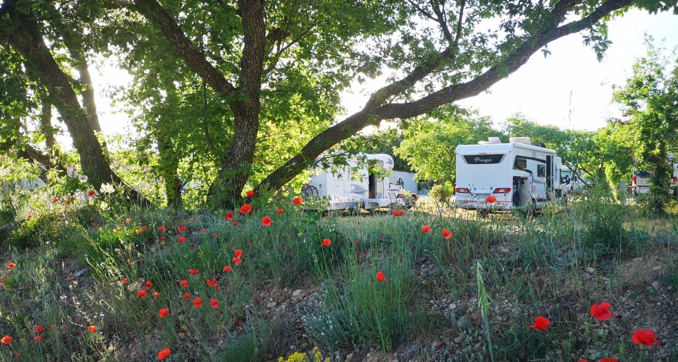 Der Platz heisst Aire de camping cars Les hautes Garrigues. Wunderbar ruhig, nur ca, 10km vom Colorado Provencal entfernt und bis Ende Mai mit 11,50€ incl Strom (ab 1.6.dann 15€) recht günstig.