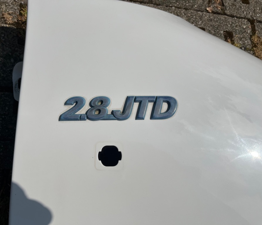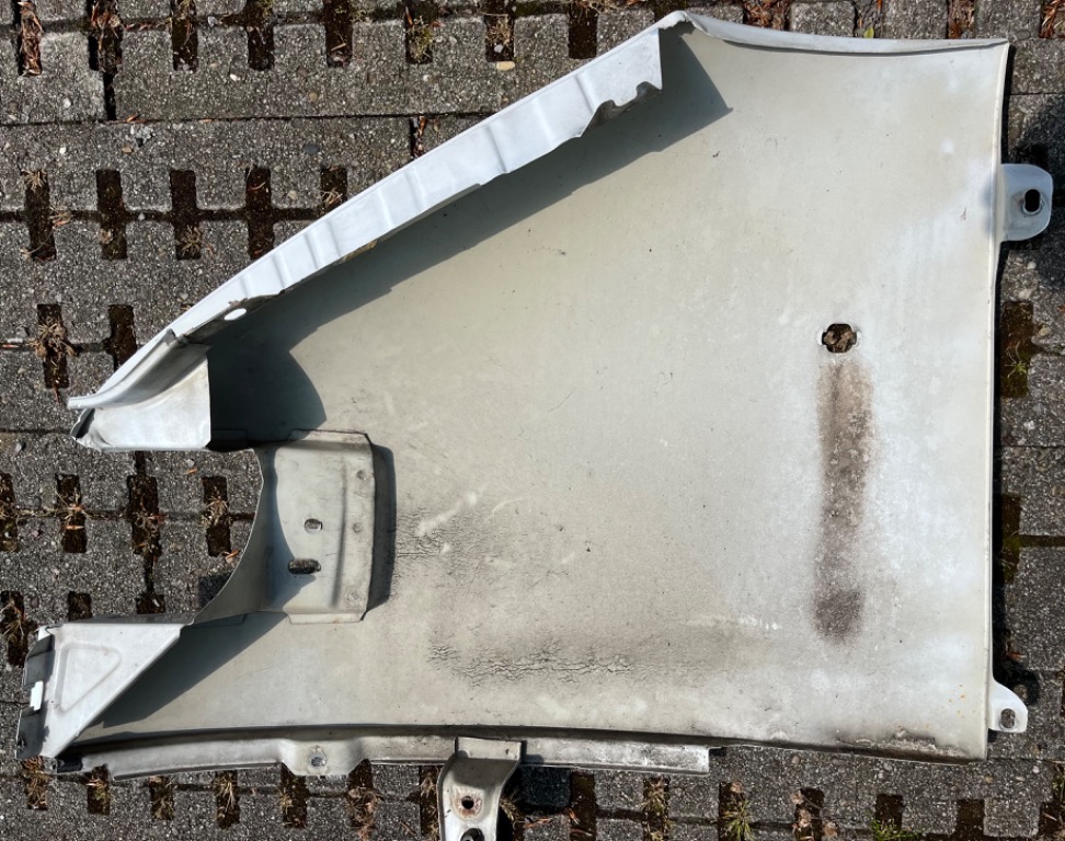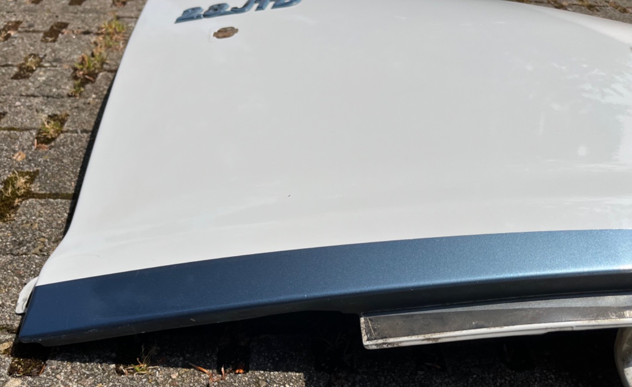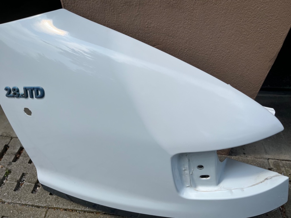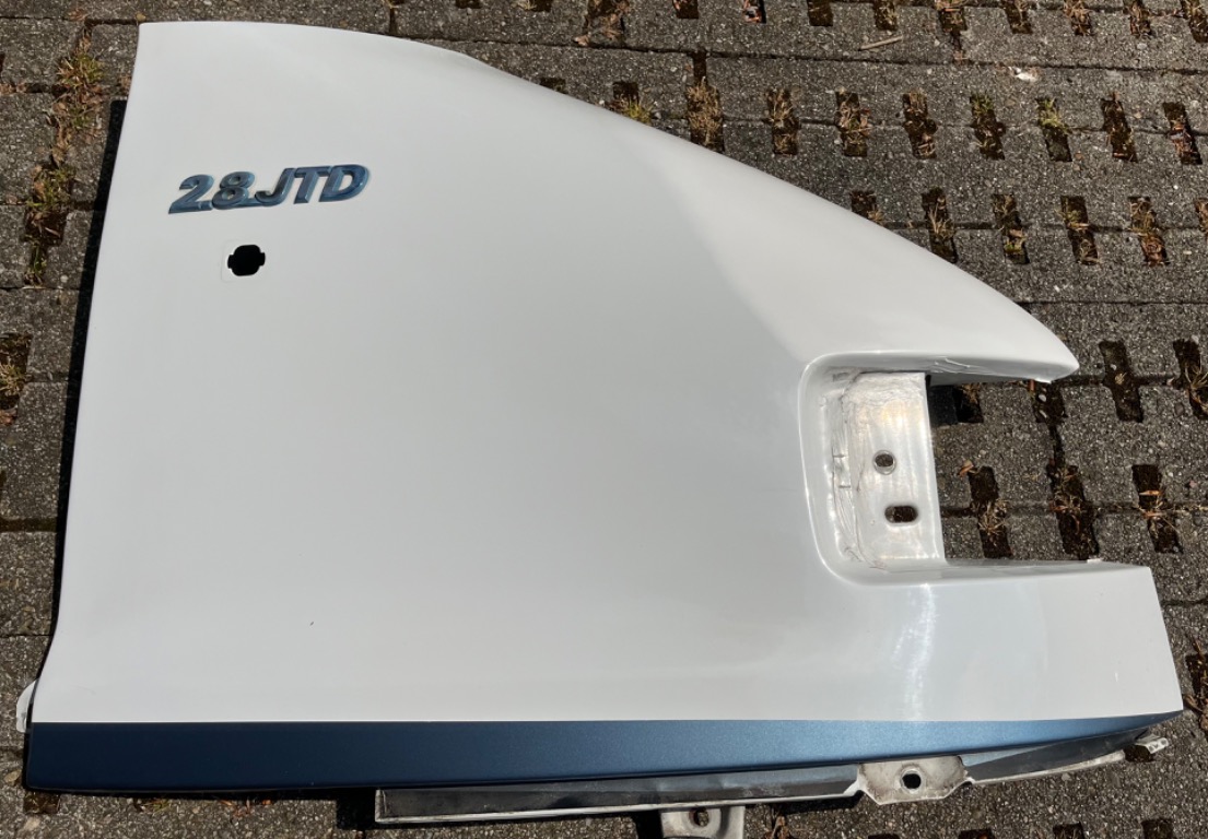 Habe noch einen rostfreien originalen rechten Kotflügel vom AK 595 rumliegen. Der hatte eine kleine Beule, die inzwischen ausgebessert und lackiert wurde. Man sieht nur noch einen leichten Farbunterschied beim weißen Lack. Ansonsten einwandfrei und rostfrei, mit Schriftzug 2,8 JTD, sowie des blauen Dekorstreifens.