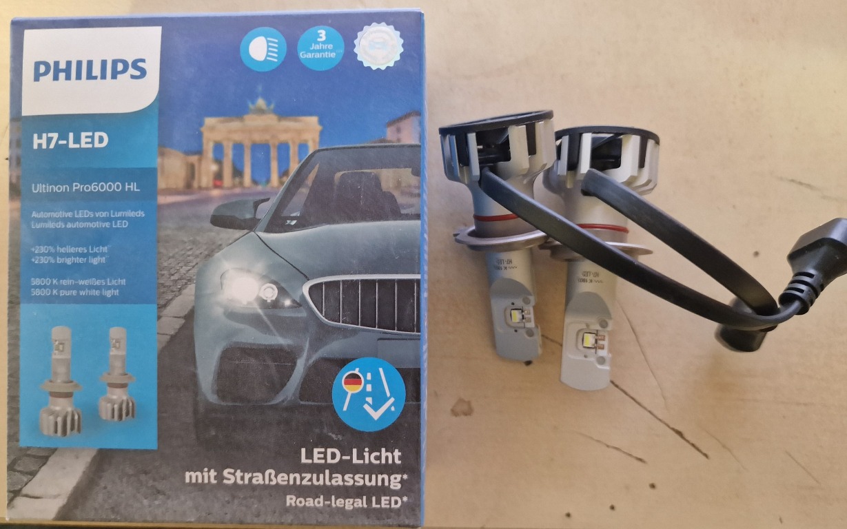 Von einer geplanten aber nicht erfolgten Umrüstung habe ich noch vier H7 LED mit Zulassung für Ducato und Artverwandte (2 x für Abblendlicht, 2 x für Fernlicht)..