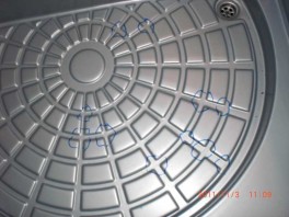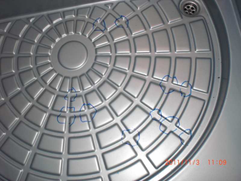 Wichtig ist mir, daß der großflächige Druck der Siebdruck-Holzplatte auch großflächig und gleichmäßig von der gesamten Bodenfläche der Duschwanne aufgenommen wird, also von allen Buckeln " u n d " den vielen Zwischenrinnen gleichzeitig.