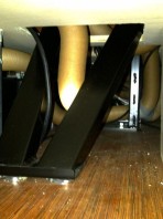 Das dürfte aber kein Problem sein, da unter dem Tisch keine so große Belastung auf den Fußboden kommt. Zusätzlich hätte man die Möglichkeit, kleine Abschnitte des Brettes zu verwenden um den Boden an anderer Stelle abzustützen.