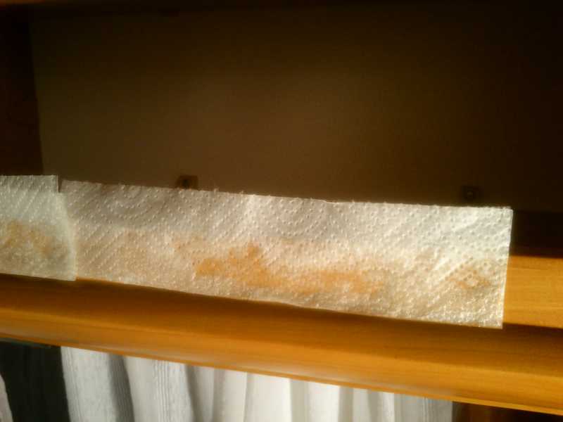 Das Mittel soll auch einwirken können. Deshalb hab ich Haushaltspapier damit getränkt und diese auf die Kleberstellen aufgelegt.