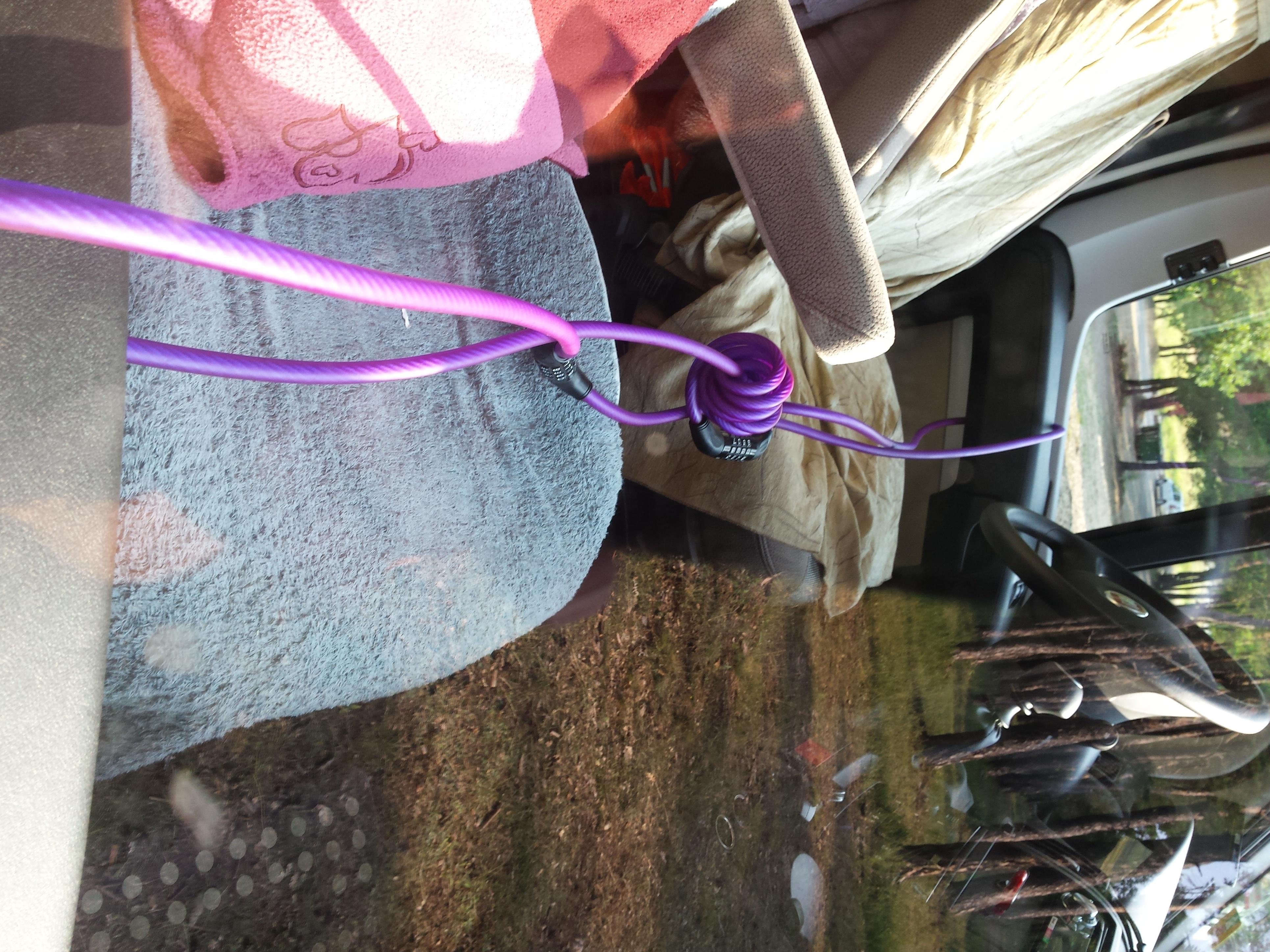 Fahrradschloss hängt rechts und links am Griff. Ist im nu verschlossen und zur Not kann ich trotzdem ganz schnell Losfahren ohne das Schloss zu öffnen.
