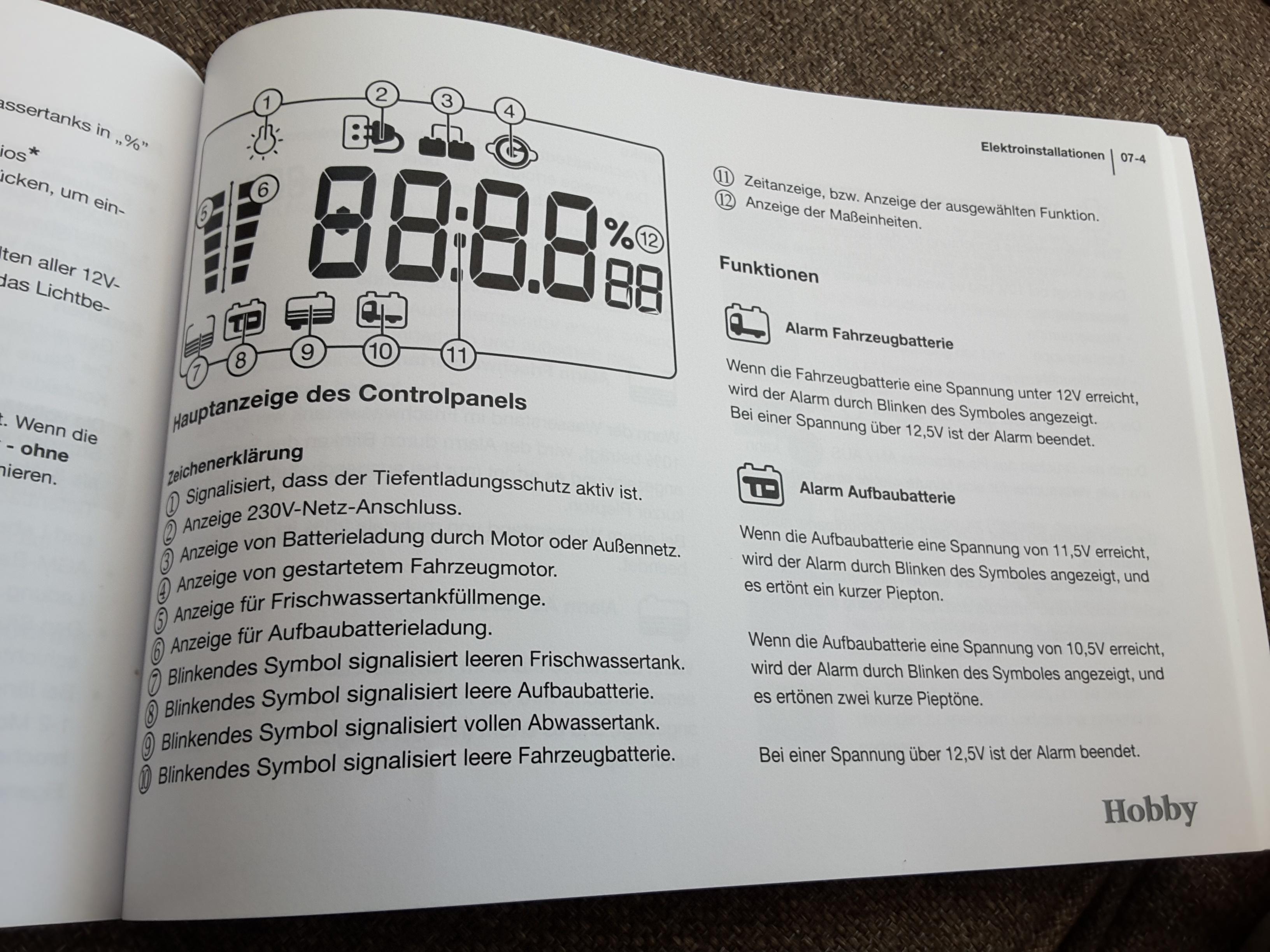 der Füllstand in % des Frischwassertank ist abrufbar über die untere rechte Taste mit dem Tanksymbol. Der Füllstand des Abwassertanks wird bei vollem Tank mit einem blinkenden Symbol in der Anzeige an dritter Stelle signalisiert. Siehe anbei auch den Auszug aus der Bedienungsanleitung.Gruss