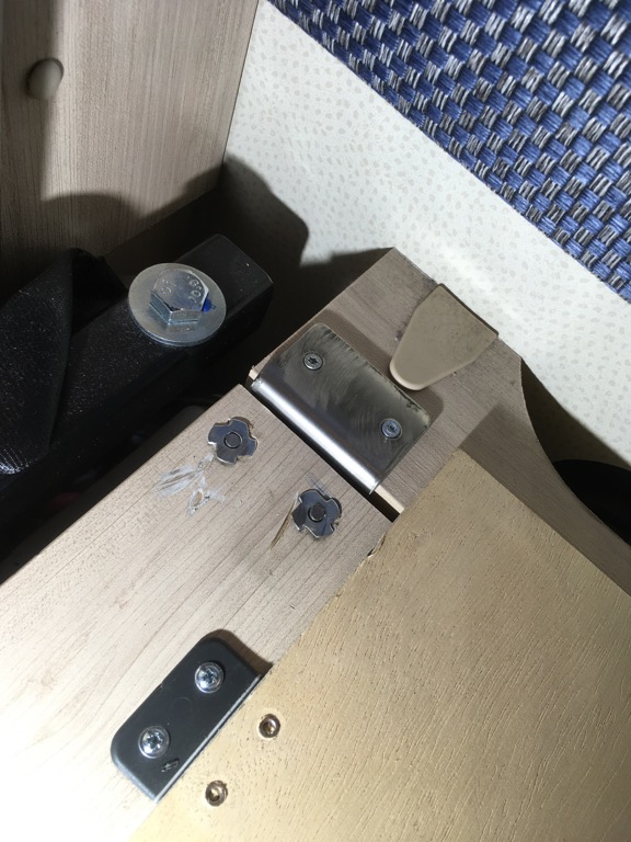 Hallo, so nachdem gestern großer Instandsetzubngstag war bevor es Ostern genitalien geht, nach der Kloreperatur mit Wasser im Womo, in anderem Post zu finden, Weniger ein Umbau als eine erforderliche Instandhaltungmaßnahme der Sitzbankunterkosntuktion über dem Wassertank. die Verbindung war mit so einem Witzplastik verschraubt, das natürlich durchgebrochen ist, ich habe aus 3mm Beach ein Z gebogen, auf der einen Seite durchgeschaut, und auf der anderen aufliegen lassen. die "dekoteile" aus stoff waren mit ner Mini spax angeschraubt, waren natürlich alle abgerissen da man mit dem Poster bei sitzen ja draufrückt ... hab das pragmatisch und doch nicht ganz hässlich mit senkUscheiben gemacht.