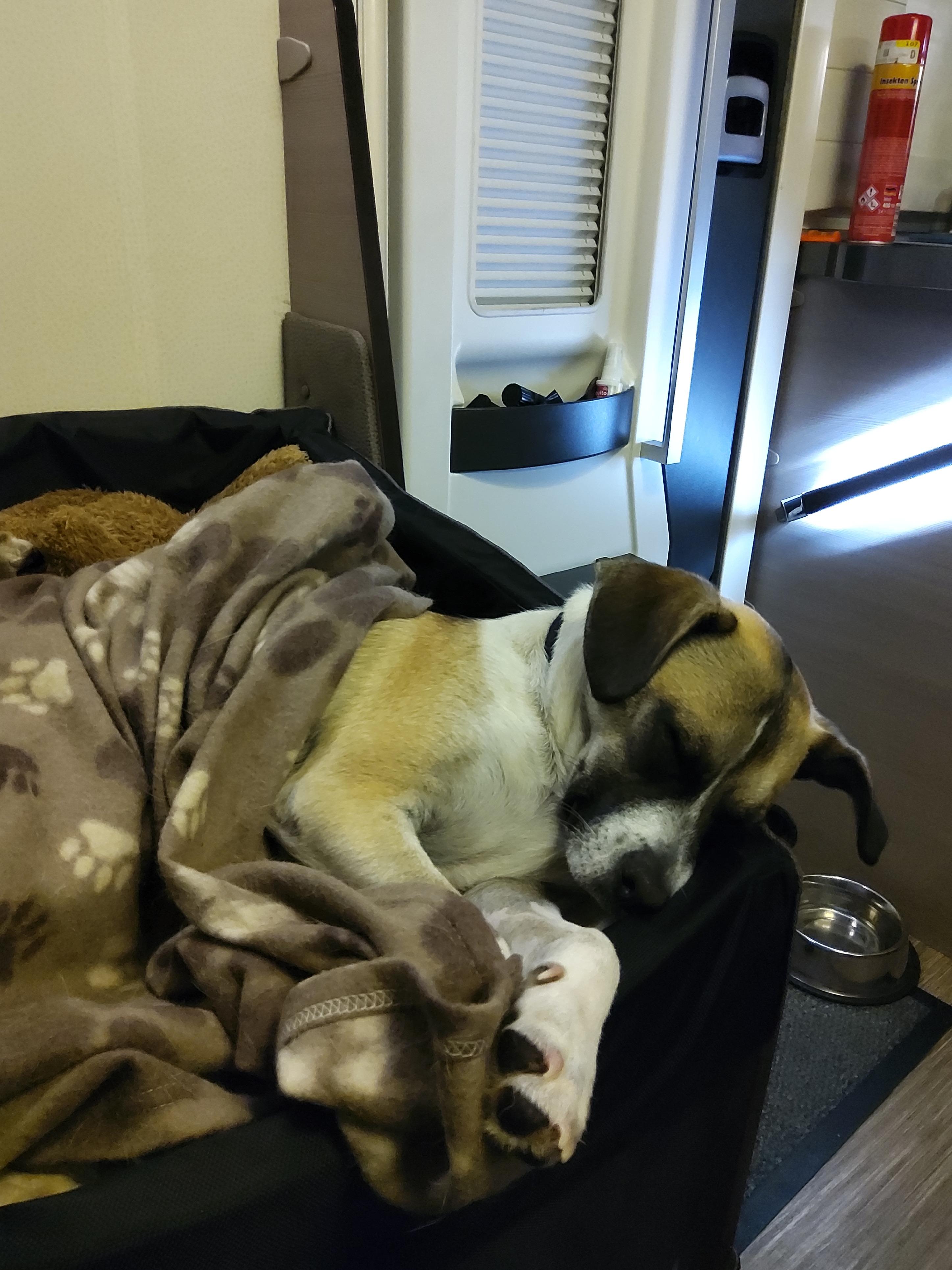 Das ist sein fester Platz während der Fahrt, oder zum Schlafen. Und er mag es, da er sozusagen immer dabei ist, alles sieht, rausgucken kann, nicht angepustet wird von der Heizung oder Zugluft. -