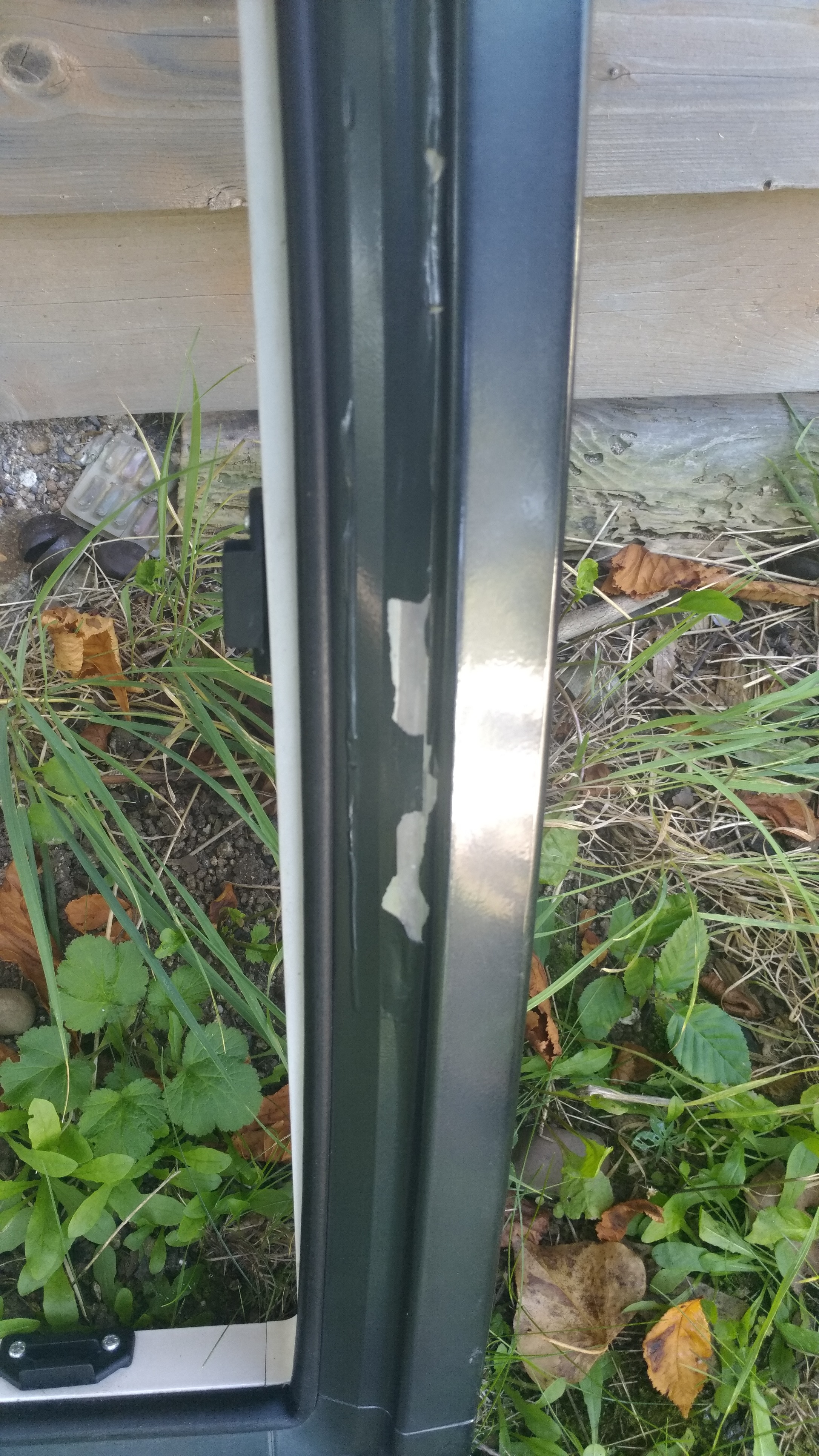 Bei genauerem hinschauen konnte man von aussen sehen das sich der Rahmen auf der rechten Seite verformt hatte. Ich habe mir heute die Zeit genommen und habe das Fenster ausgebaut beim drehen des Fensters ( inklusive Rahmen) konnte ich richtig hören wie Wasser hin und her schwappte. Es gibt an den jeweiligen enden eine Schraube auf der Seite wo sich der Rahmen verformt hatte drehte ich die Schrauben raus siehe da etwas braun gefärbtes Wasser ist rausgekommen. So wie es aussieht muss das innen Leben aus Eisen sein, aussen ist es aus Aluminium es keinen Sinn diesen Rahmen nochmal einzubauen so deformiert wie er ist.