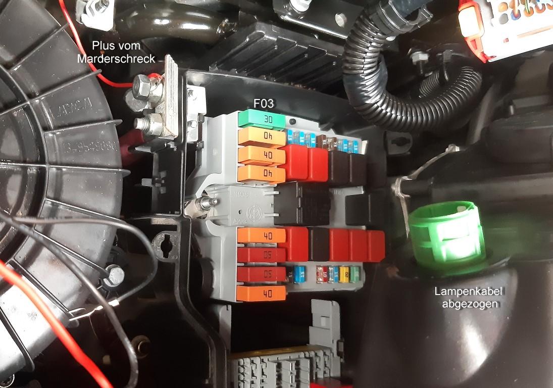 Die Plus-Leitung vom Marderschreck soll an die Batterie. Da bietet sich eine der beiden dicken Schrauben unter der Zunge für die Starthilfekabel an. Aber VORSICHT mit dem Schraubenschlüssel!!! Der ist beim Drehen auf Plus - und wie!!! Und für die Masse vom Marderschreck brauche ich offensichtlich einen Stromdieb. An F03 liegt laut Handbuch "Zündschalter (+Batterie)", aber ist das wirklich Zündungsplus? Oder ist eine andere Sicherung geeignet? Jedenfalls muss ich erst einen Stromdieb bestellen. Bis dahin habe ich die Masse vom Marderschreck wirklich auf Masse, und er blinkt und piepst (hoffentlich) vor sich hin.