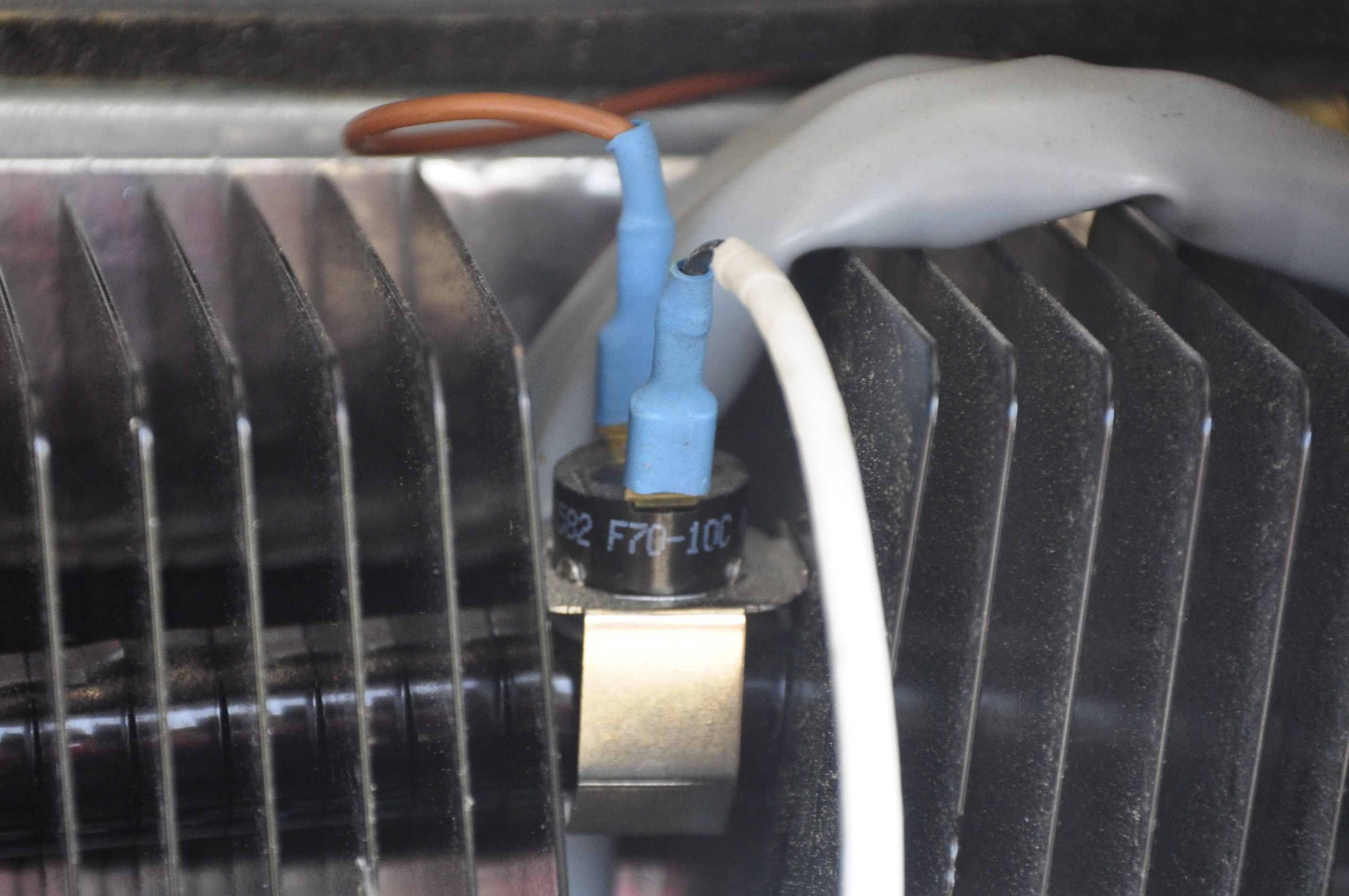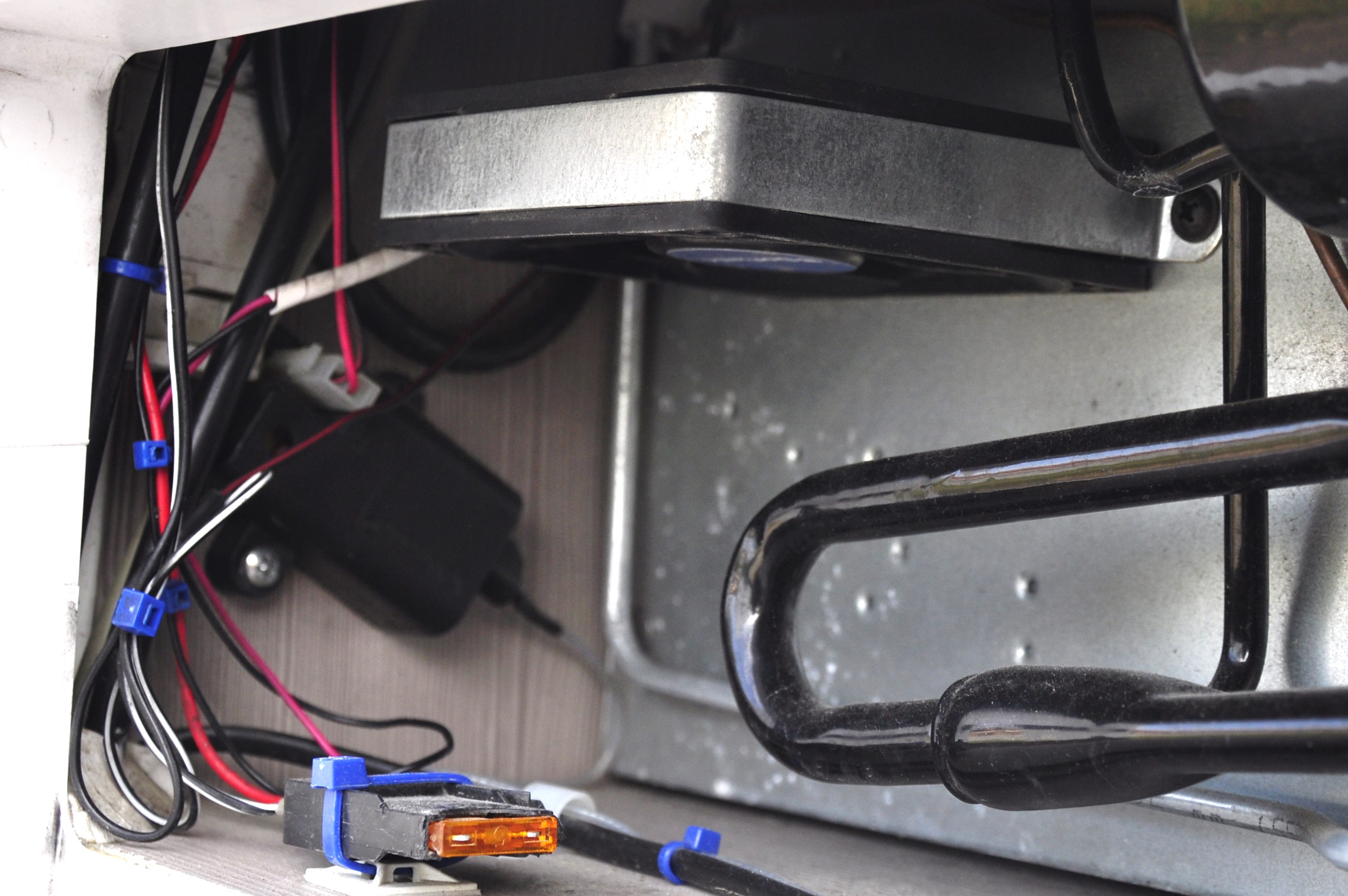 er schaltet ja auch über ein Themperaturfühler und ich wollte mir das Lüftungsgitter nicht noch mit einem Lüfter zubauen.Die Stromkabel habe ich an den Kabeln für die Kühlschrank Beleuchtung nach drausen gezogen - geht mit einem dünnen Draht ganz gut.