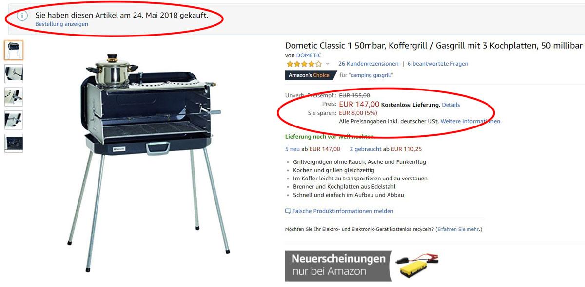 Verkaufe meinen Dometic (früher Cramer) Gasgrill. Der Grill befindet sich in einem neuwertigen Zustand (siehe Fotos), wurde keine 10x benutzt. Neupreis lag bei Kauf im Mai 2018 bei 155,- EUR. Beschreibung: 3 Kochstellen, Grillleistung ca. 5,3 kW, Gasverbrauch ca. 385 g/h, Koffergröße 62 x 12,8 x 28,8 cm, Saftschale mit Rost 54,5 x 23,8 cm, Gewicht ca. 10 kg, Gasdruck 50 mbar für Gasflasche. Abzuholen in 89518 Heidenheim. Festpreis 99,- EUR.