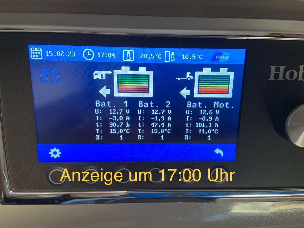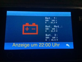 Ich muss allerdings gestehen, dass im letzten Oktober die Batterien 1x ziemlich leer gezogen wurden, so dass sich der Kühlschrank nachts selbst ausgeschaltet hat. Ich bin aber am nächsten Tag 500km gefahren, sodass die Batterien wieder voll waren (laut Anzeige).