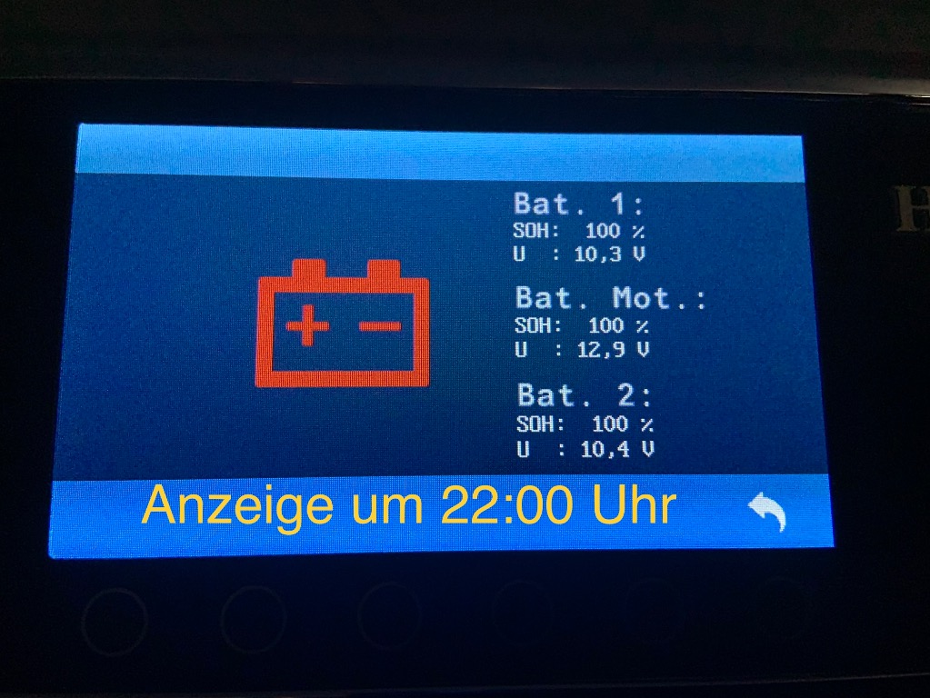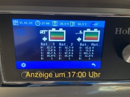 Nach voller Ladung geht die Anzeige schnell auf einen Wert von 12,4 Volt runter und bei der Restlaufzeit „t“ springt der Wert bei beiden Batterien um teilweise den doppelten Wert hin und her.