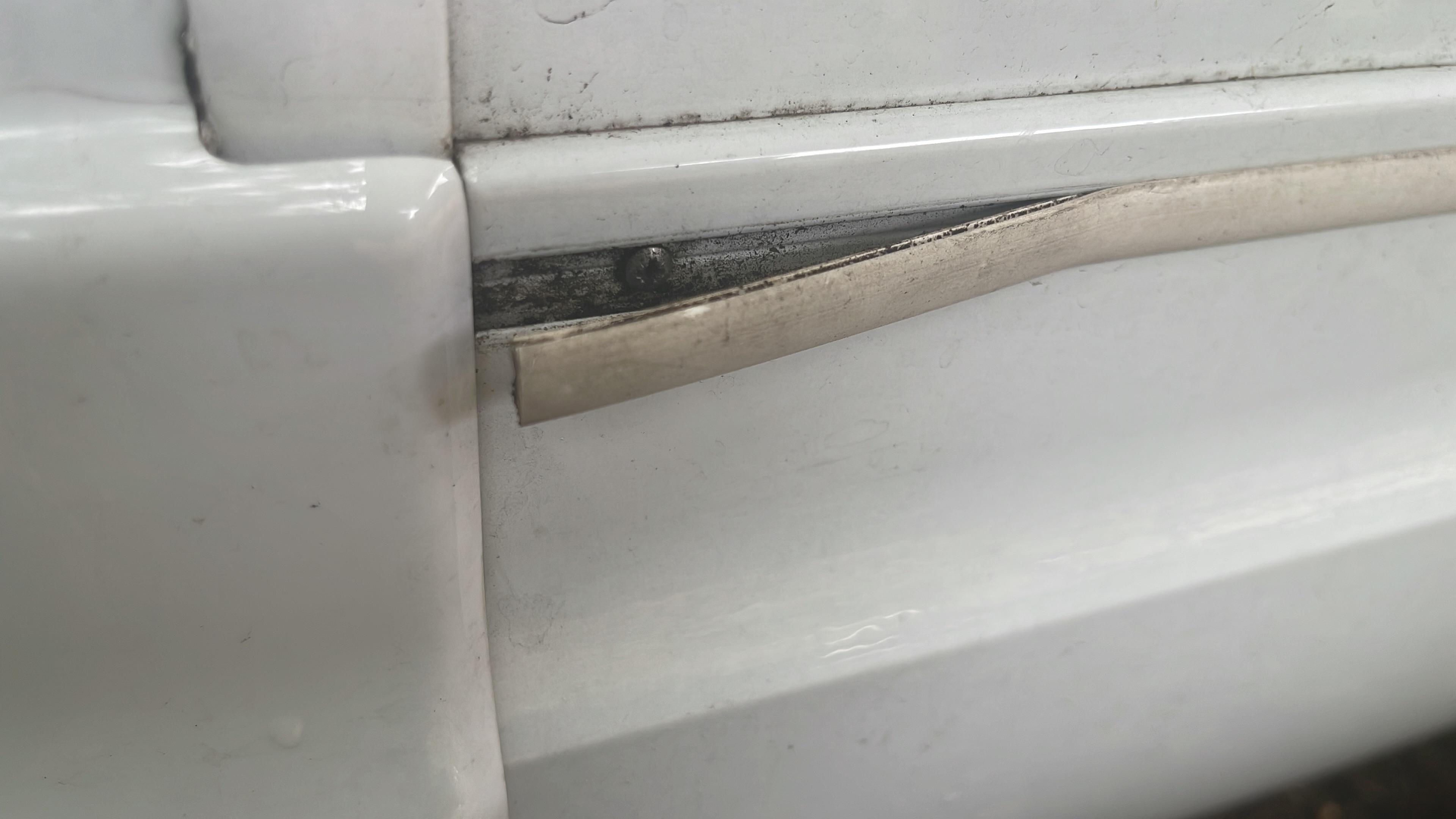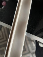 Leiste für 5 Euro aus dem Baumarkt geholt(gabs in weis und schwarz) , unten wegen Biegung eingesägt und die alte häßliche ,verzogene Gummileiste eingeklebt . Passt !