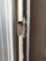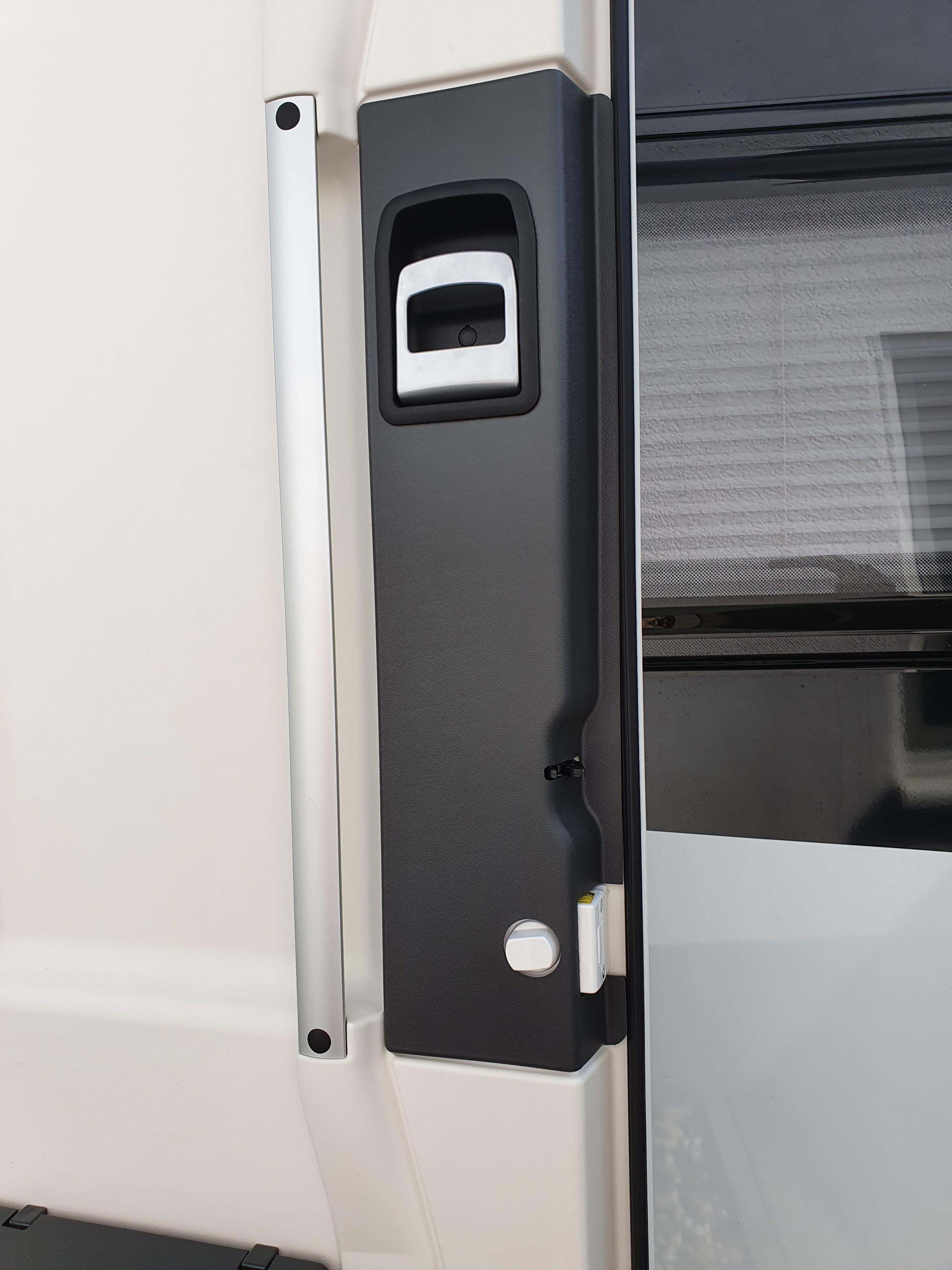 Mir hatte nämlich die Version mit komplett ausschneiden der Verkleidung weniger gefallen und diese mit nur einem Loch für den Drehknopf besser gafallen. Hat auch mit den verschiedenen Abstandsplatten die mitgeliefert werden ganz gut geklappt alles unter einen Hut zu bekommen und so wenig wie möglich vom Fliegengitterrahmen zu opfern.Die Türverriegelungen von Heosafe habe ich auch eingebaut, aber die sind ja super schnell und einfach zu montieren. Lediglich der kleine Ausschnitt am Schalousierahmen sind mit ein wenig mit Geschick und nem Drehmel verbunden.