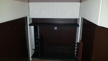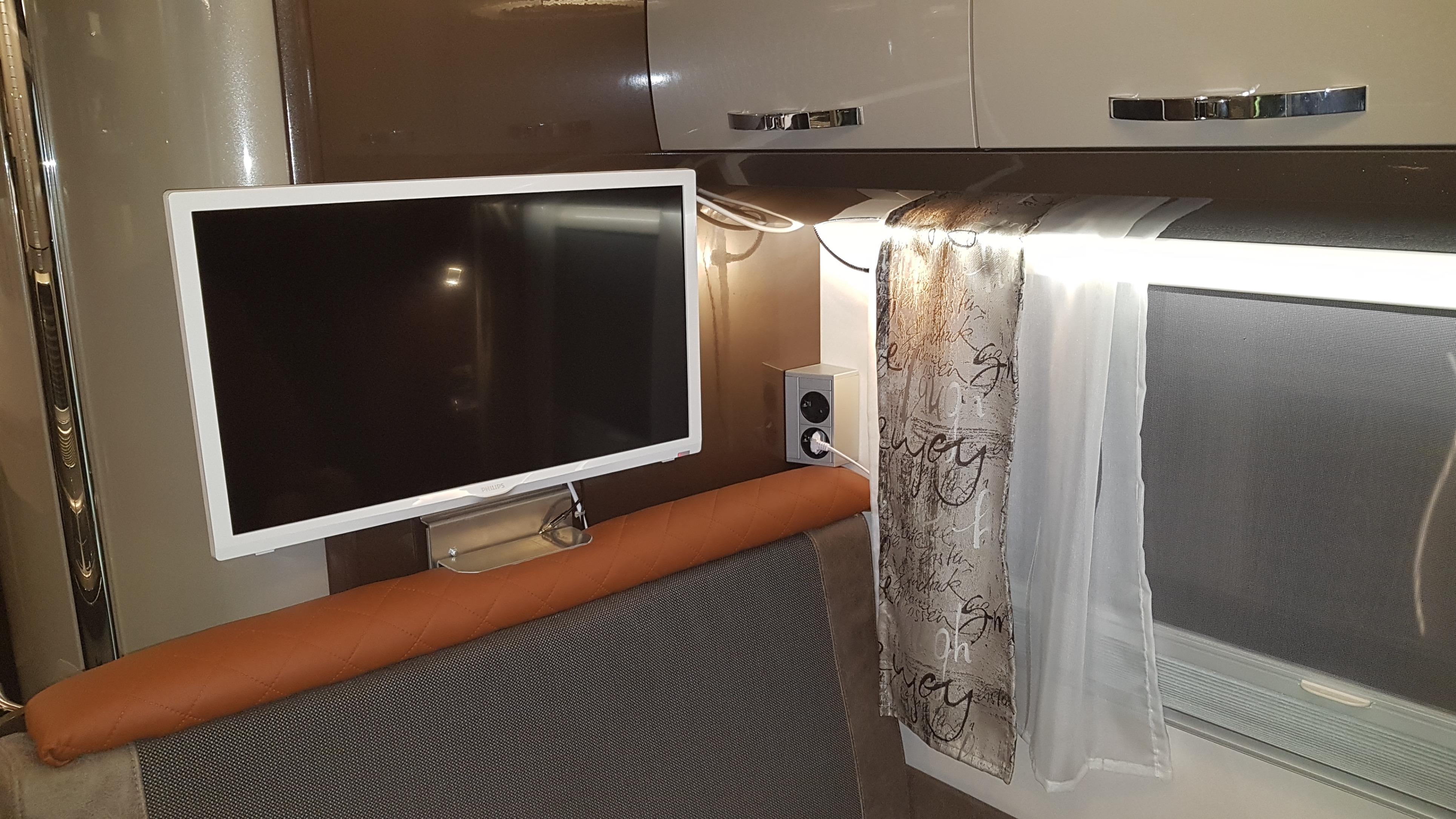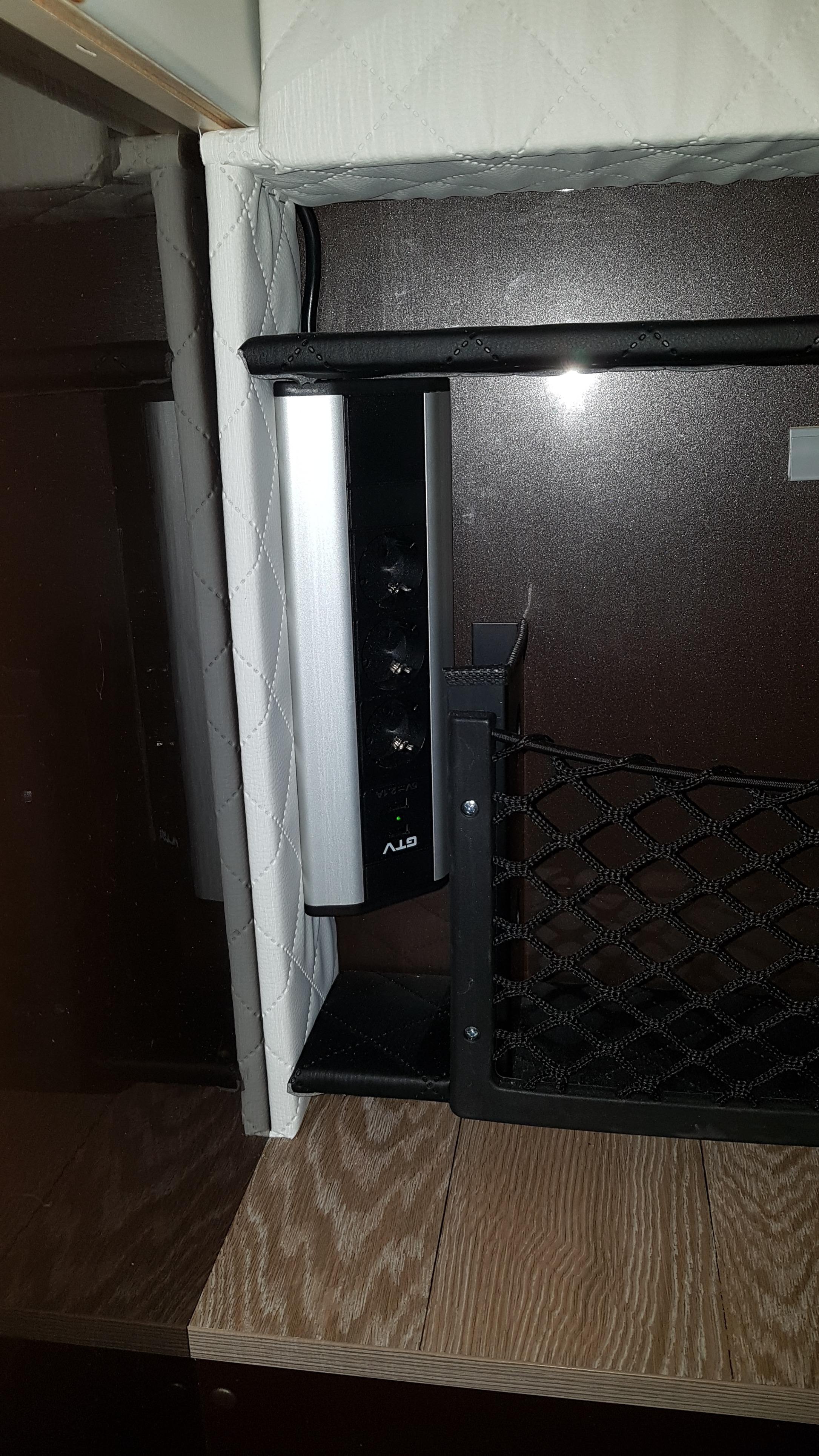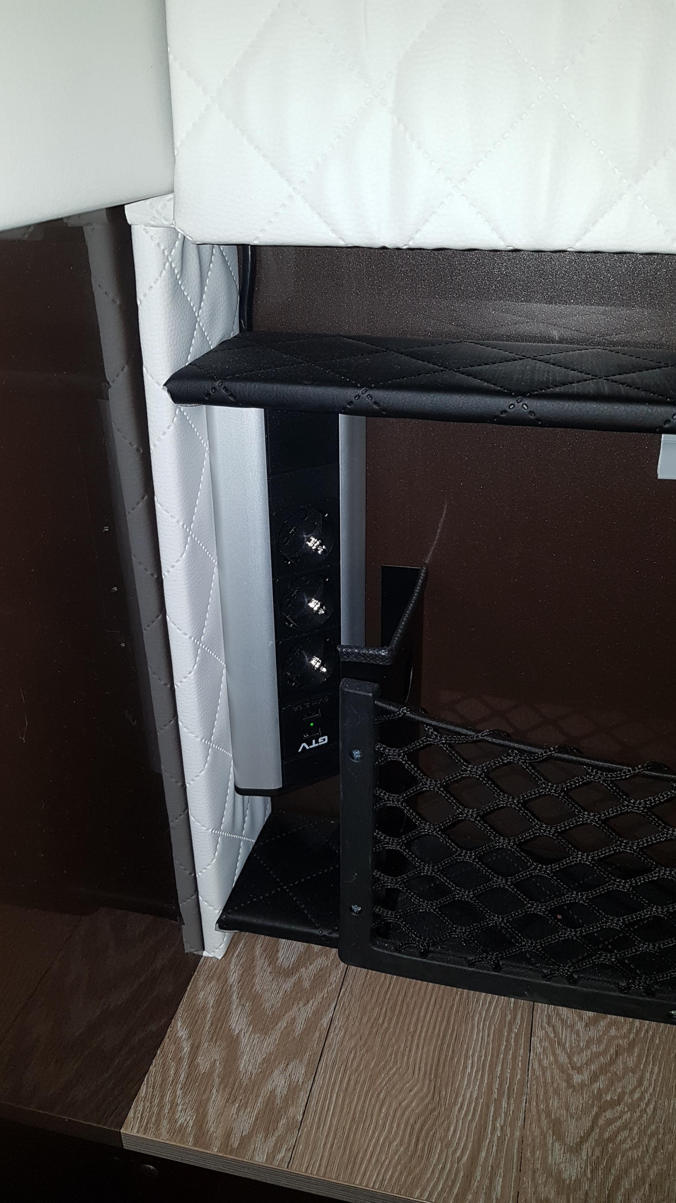Die zusätzliche Steckdose bei der Dinette bedient vorrangig den TV und den Toaster. Bei Bedarf wird Im Sommer der Deckenlüfter von dort aus versorgt. Im Schlafbereich wurde die Bettverbreiterung, zumindest für den Oberkörperbereich ,von mir nachgerüstet. Die Matratzenauflage wurde um 15 cm mit dem angefertigten Regal verlängert. Im Regal wurde ebenfalls eine Ecksteckdose mit USB Ladesteckdosen verbaut. -
