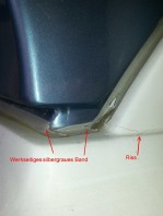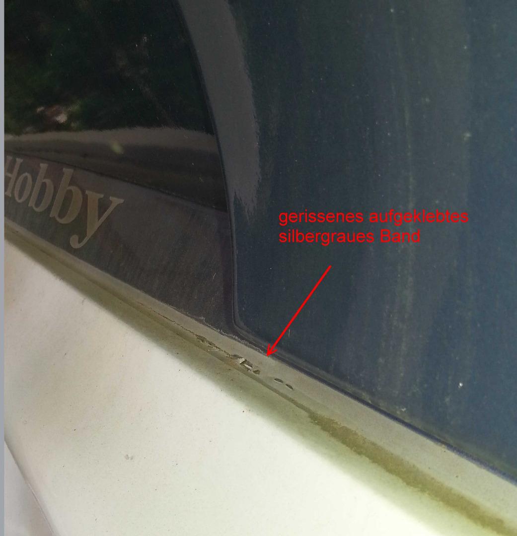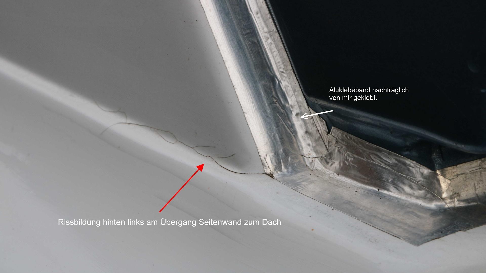 Kurz bevor ich mein Hobby 650EC ins Winterquartier gebracht habe wurde er noch mal gewaschen. Von der Leiter aus musste ich nun feststellen, dass sich am Übergang von den Seitenwänden (auf der rechten und auch auf der linken Seite) zum Dach Risse gebildet haben (Foto1). Unter dem silbrigen Aluklebeband befindet sich die Anschlussfuge zu dem blau folierten Seitenteil am Dach. Das Band habe ich vor etwa 18 Monaten aufgeklebt, weil sich auch hier Unregelmäßigkeiten (Altererscheinungen des originalen Bandes) zeigten (Foto1a). Das Band klebt und dichtet bestens ab, aber nur bei annähernd geradlinigem Rissverlauf.