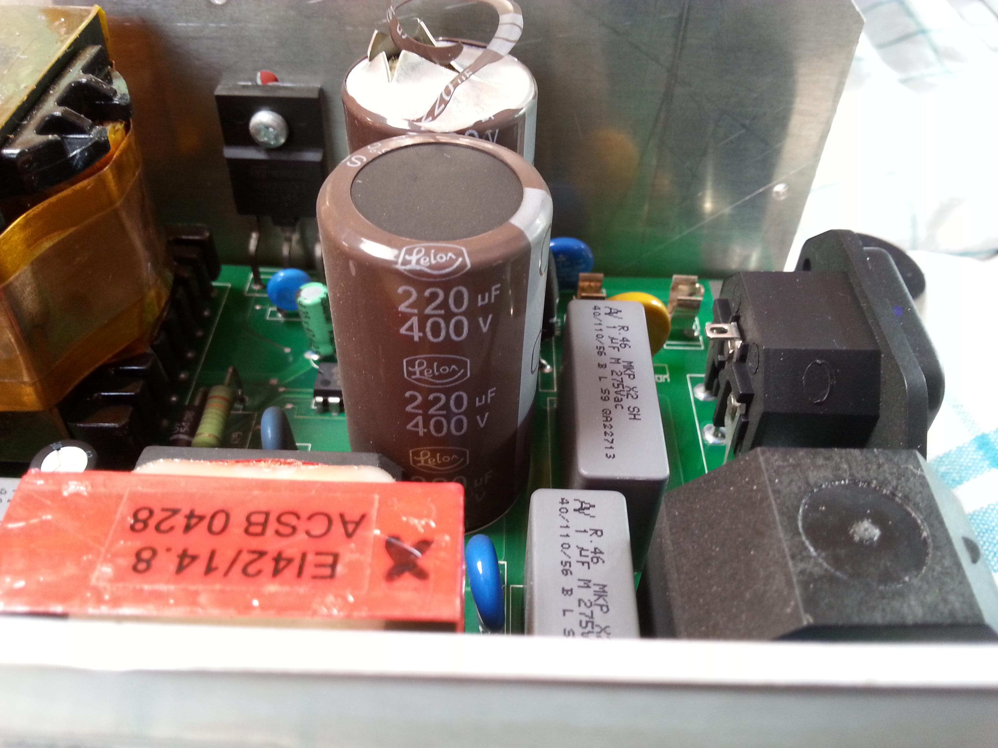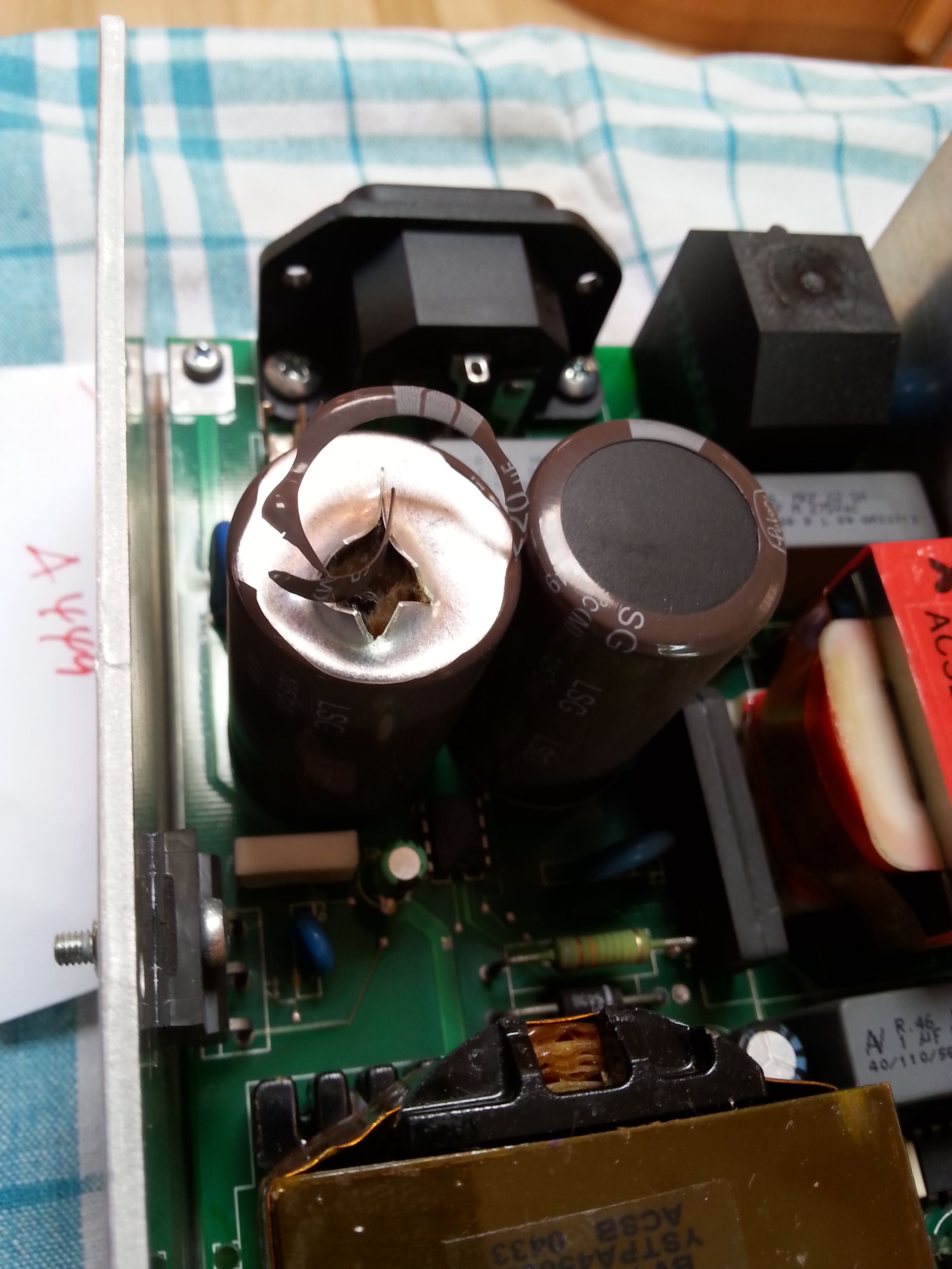 Nach dem ich das Gerät geöffnet hatte, sah ich den Grund. Ein Elektrolytkondensator war explodiert. Ich habe beide Kondensatoren ausgelötet und durch zwei neue Kondensatoren ersetzt. Das war War ganz einfach und nun funktioniert alle wieder.Bei der Bestellung der Kondensatoren musste ich feststellen, dass es bei gleichem Typ Unterschiede gibt. Die billigsten waren eingebaut und hatten nach Angabe vom Hersteller der Kondensatoren eine kurze Lebensdauer. Ich habe nun welche eingebaut die ein lange Lebensdauer haben sollen.