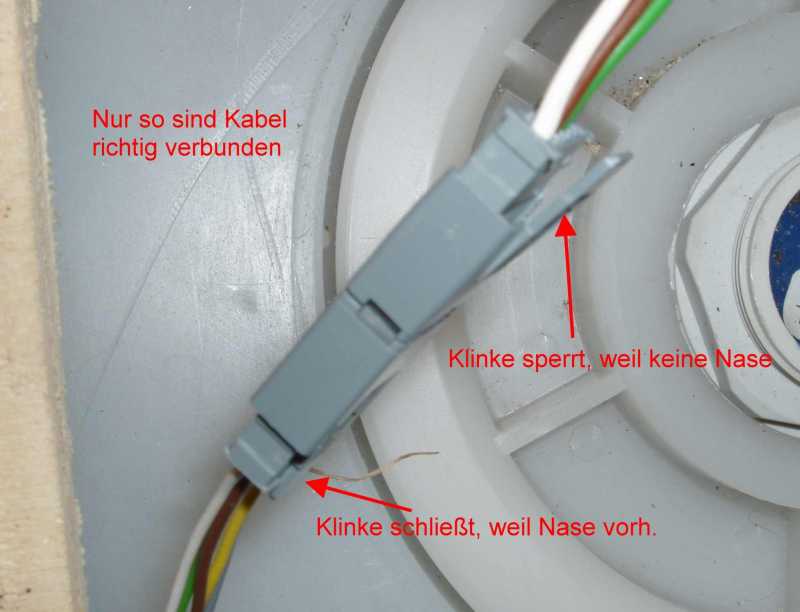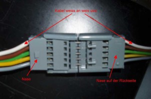 Dennoch, es ist schon verwirrend, wenn man davon ausgeht, dass die Verbindungsstecker an den Messfühlern einem die richtige Verbindung vorgeben. Aber das kann auch falsch sein, denn es müssen wohl die Kabel gleicher Farbe miteinander verbunden werden. Also am Kupplungsstück die eine Seite vom Stecker mit der Nase in die Klinke einrasten lassen und bei dem Gegenstecker nicht. Nur so sind die Kabel gleicher Farbe miteinander verbunden. So gemacht und alles ist wieder ok. Die Anzeigen funktionieren wieder. Habe zum besseren Verständnis noch zwei Bilder (leider nicht 100%ig scharf) angefügt.