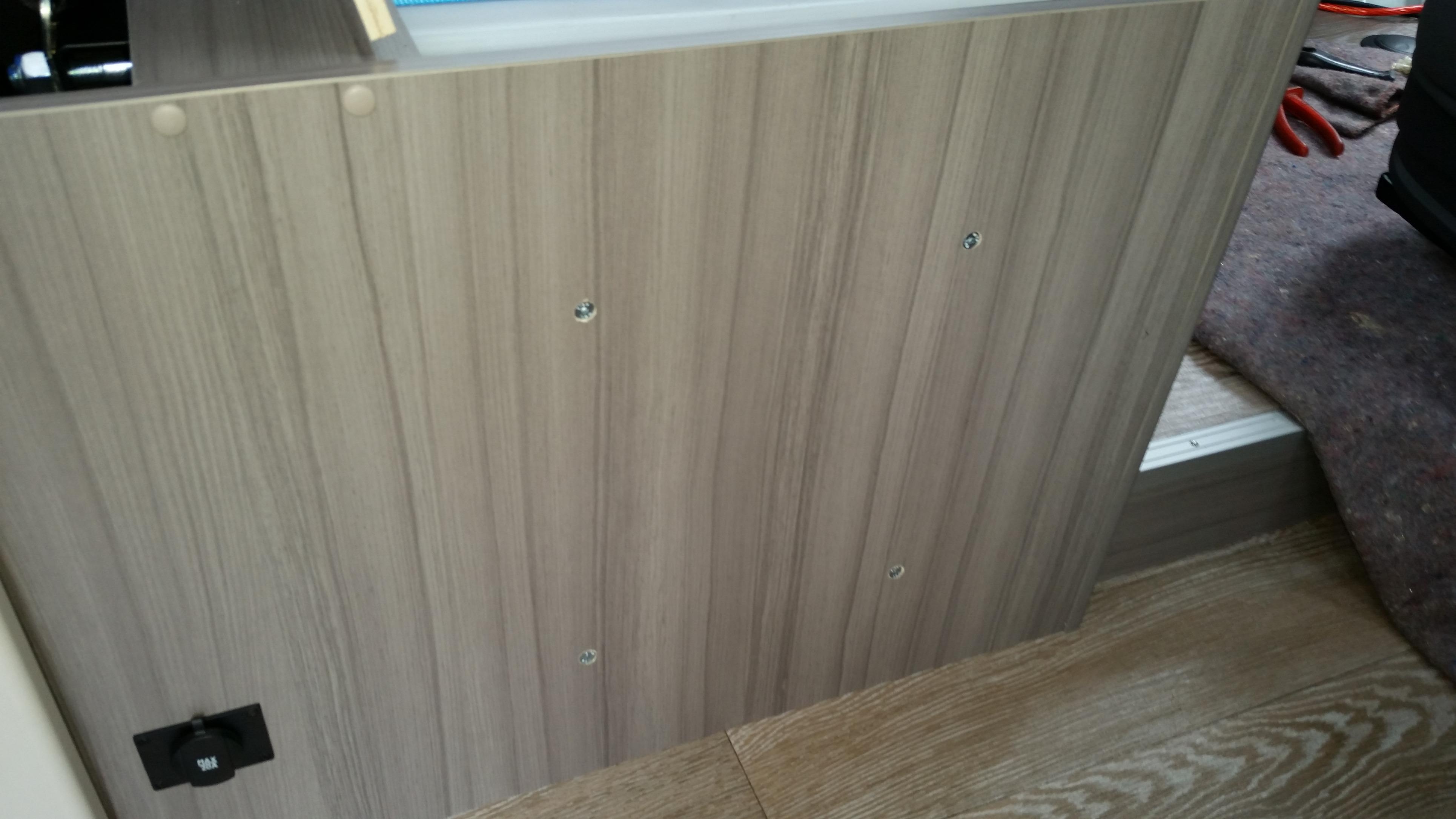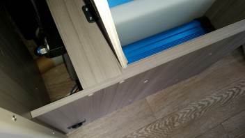 Von dort aus sind die Kabel viel leichter zu ziehen, weil ja hinter der unteren seitlichen Fußabdeckung unter der Dinette der Landstromanschluss sitzt. Dort kann man wunderbar die Vorrangschaltung unterbringen.