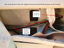 Über dem Zwischenraum links vom Schrank kannst Du die Kabel durch die Wand in den Hohlraum im der Fahrerkabine verlegen (da wo der Sicherheitsgurt rauskommt = Foto 2). Möglicherweise musst Du dazu ein neues Loch bohren.