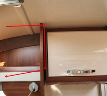 Die bewusste Platte ist mit jeweils einer Holzschraube auf beiden Seiten in den Schränken befestigt. Außerdem befinden sich hinter dem Hobby-Display zwei Haltebügel, die mit der Rückwand verschraubt sind. Dazu muss man das Display ausbauen. Dazu an beiden Seiten die Frontfolie anheben, dahinter verstecken sich die Befestigungsschrauben. Diese muss man lösen, das Display rausnehmen und schon kommt man an die beiden Bügel.