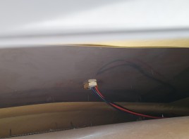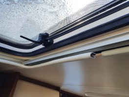 Auf der rechten Seite: 2 Stühle 2 Fußauflagen + kleiner und großer Tisch und drei volle Boxen mit Stromkabeln (drei verschiedene Längen, das längste (25m) auf einer Kabeltrommel, Wasserschlauch mit verschiedenen Anschlüssen (ich benutze immer meinen eigenen Schlauch und habe daher auch noch nie Probleme mit Verkeimung des Wassers gehabt), der Grill mit Zubehör, der Bodenteppich und ein Sunblocker für die Markise. Auf der Tür ein Schuhregal und ein Fach für die Werkzeugbox.
