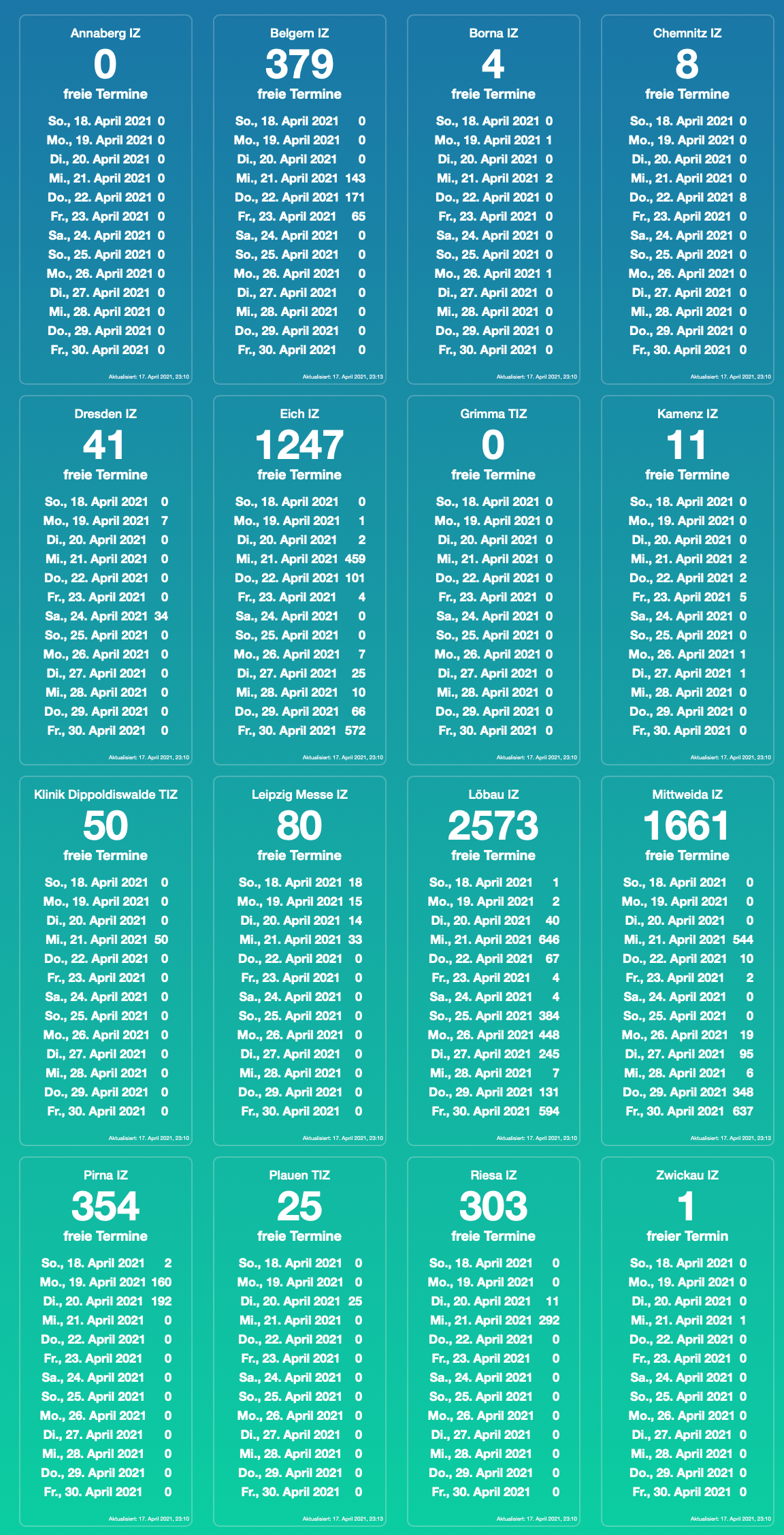 aktuell (17.04.2021, 23:10) werden in Sachsens Impfzentren etwa 6.000 freie Termine angezeigt.