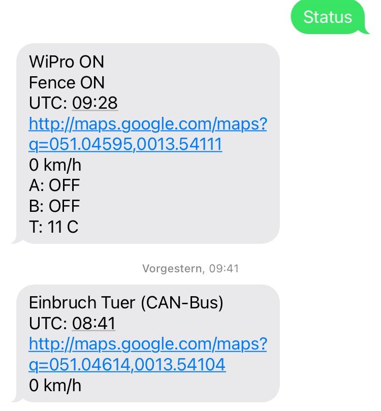 Der Pro-Tracker nutzt GPS und GSM, dafür gibts einen Business-Tarif von der Telekom für mtl. etwa 1€ + SMS-Kosten. SMS-Benachrichtigung sieht so aus: