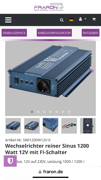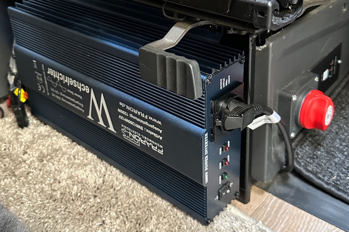 Dann bin ich auf den Fraron , Artikel-Nr. SWI1200W12V-0, Wechselrichter reiner Sinus 1200 gekommen! Reicht mir, ist leise und passt perfekt hinter den Sitz! Eingebauter FI Schalter!!!