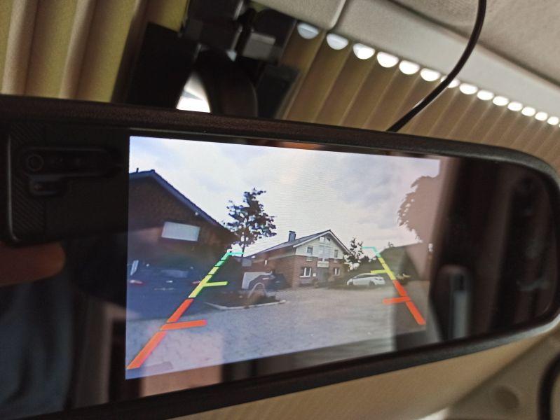 3- Die serienmäßige Rückfahrkamera hat bei beladenem Fahrradträger nur diese dargestellt:s . Deshalb habe ich auf dem Kennzeichen eine zusätzliche Kamera installiert, als Monitor habe ich ein Aufstecksystem auf dem nutzlosen Innenspiegel verwendet. Die Übertragung erfolgt per Funk und steckt hinter dem Kennzeichen bzw. unter der Innenbeleuchtung. Strom habe ich von der Kennzeichenleuchte bzw. von den Leselampen abgezweigt, dem Monitor habe ich noch einen Schalter spendiert.