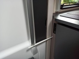 6- Da mir auch die Sicherheitsschlösser von den Profi-Herstellern für unseren Zweck zu teuer / aufwändig waren habe ich einfache Lösungen eingebaut: Stahldraht mit Karabiner vorne, Verriegelungsstange an der Eingangstür. Soll bei uns nur nächtliche Besucher fernhalten.