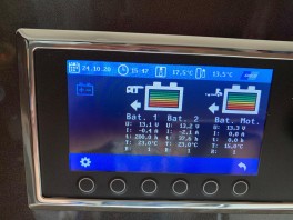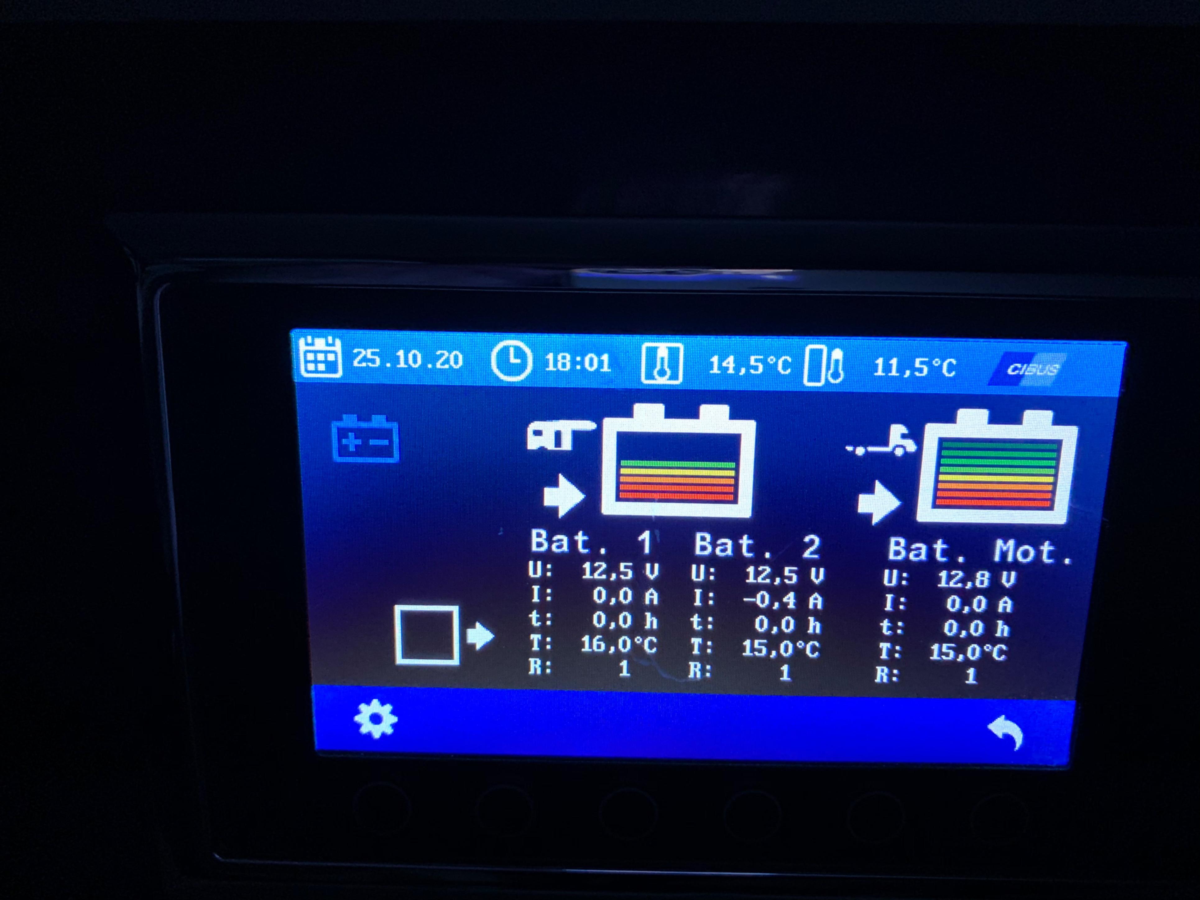 A. Ich habe zunächst die Aufbaubatterien über Landstrom voll aufgeladen. Im Steuerungsdisplay werden diese auch als voll geladen angezeigt.
