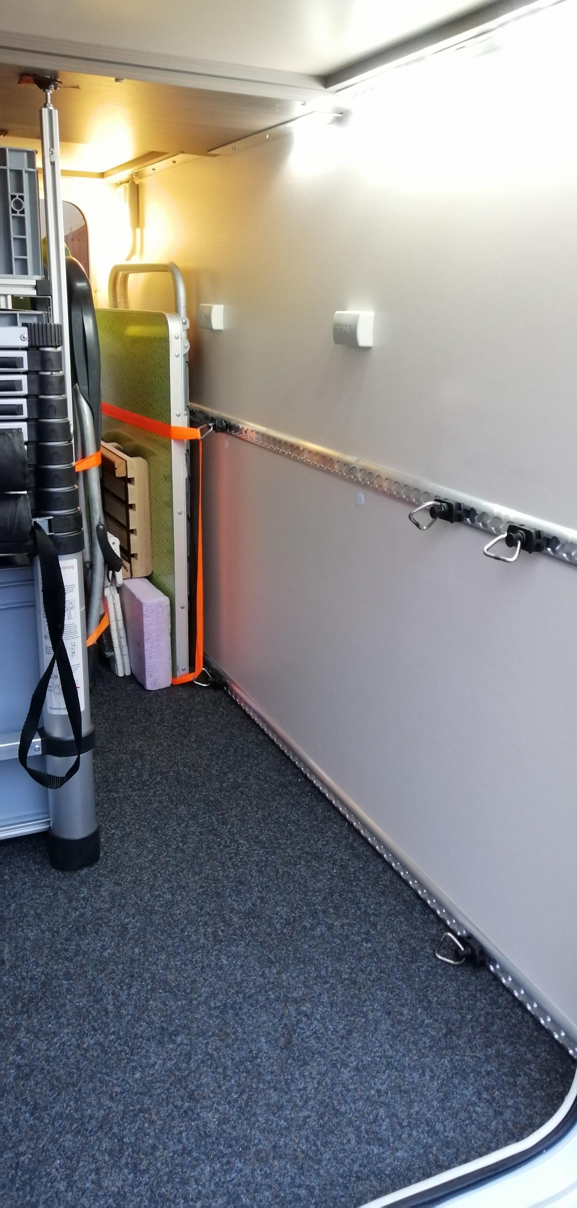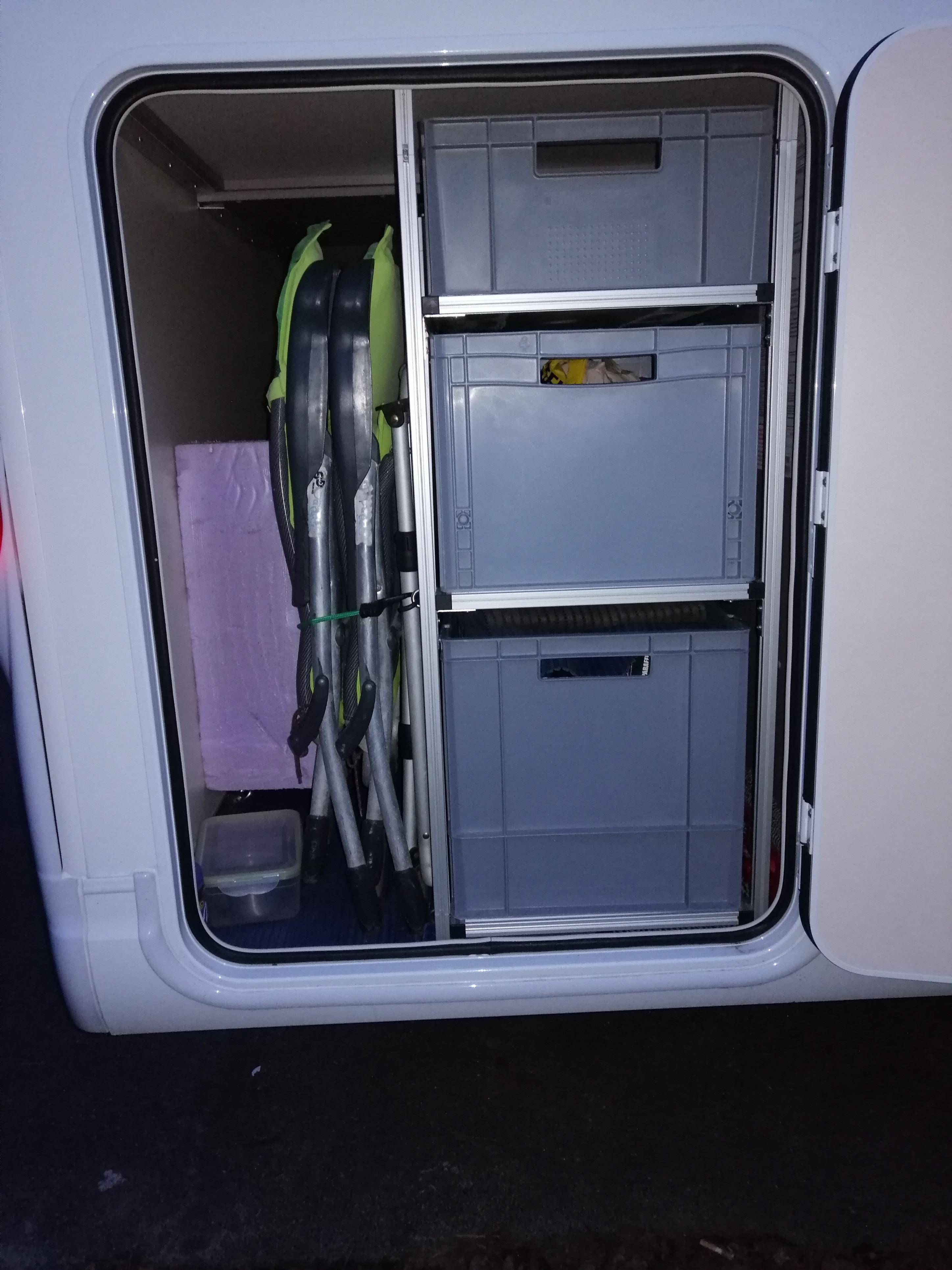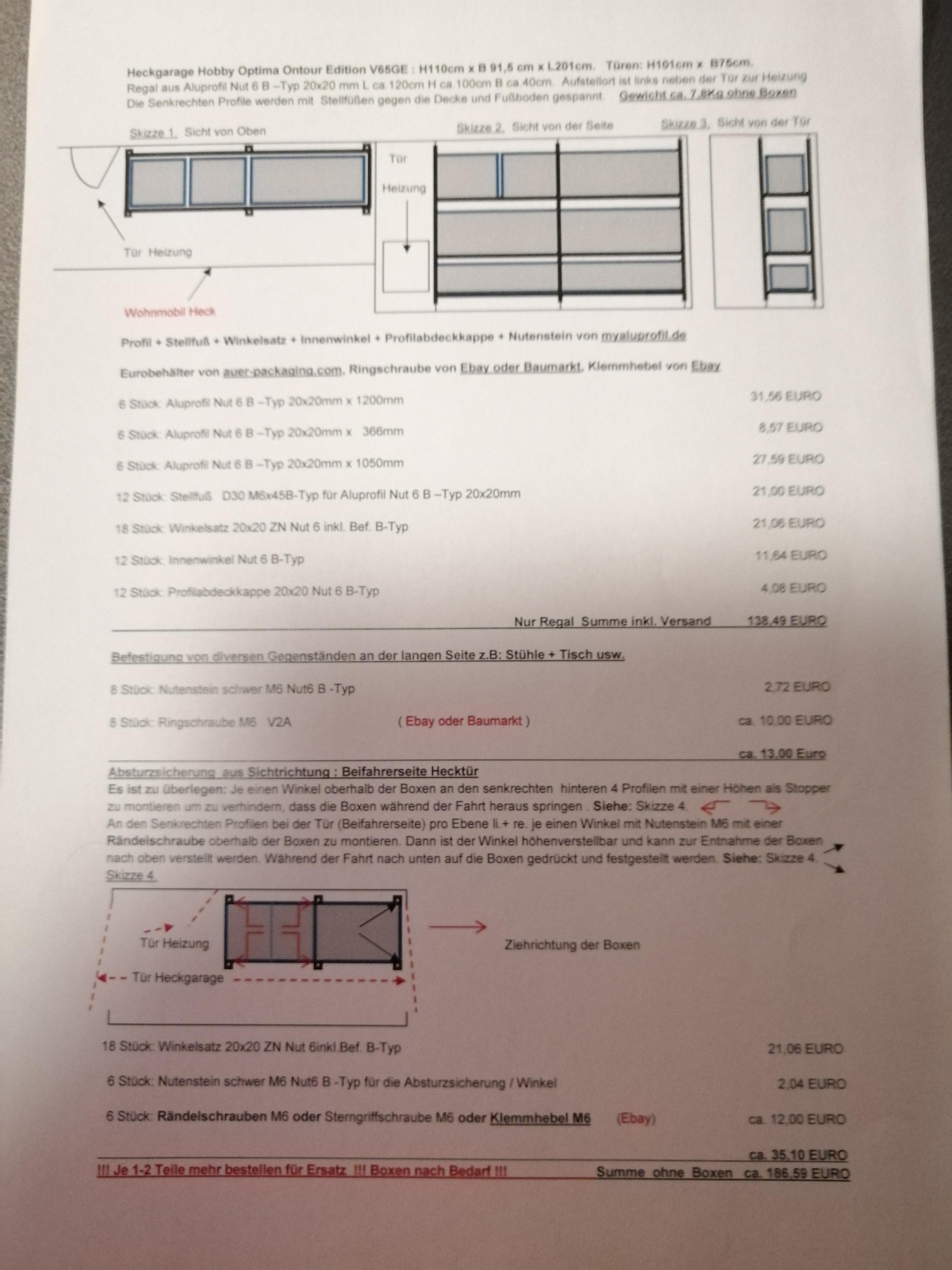 Das System ist selbst zusammenstellt von my aluprofil und die Boxen von Auer (haben die größte Auswahl) Kosten des Regalgestell ca. 150 Euro, Gewicht ca. 7,8 kg, L= 120cm B= 45 m, H = 110cm alles ca. Die Profile 2x2 cm B Typ, man kann alle auf den mm zuschneiden lassen. Die Boxen hatte ich zum Teil schon. Auf der Fahrerseite ist LED und ein Lichtschalter nachgerüstet. 2 x Airlineschienen an der Heckwand und die alten von Hobby verbauten Zurrschienen habe ich über / unter der Heizungstür angepasst.