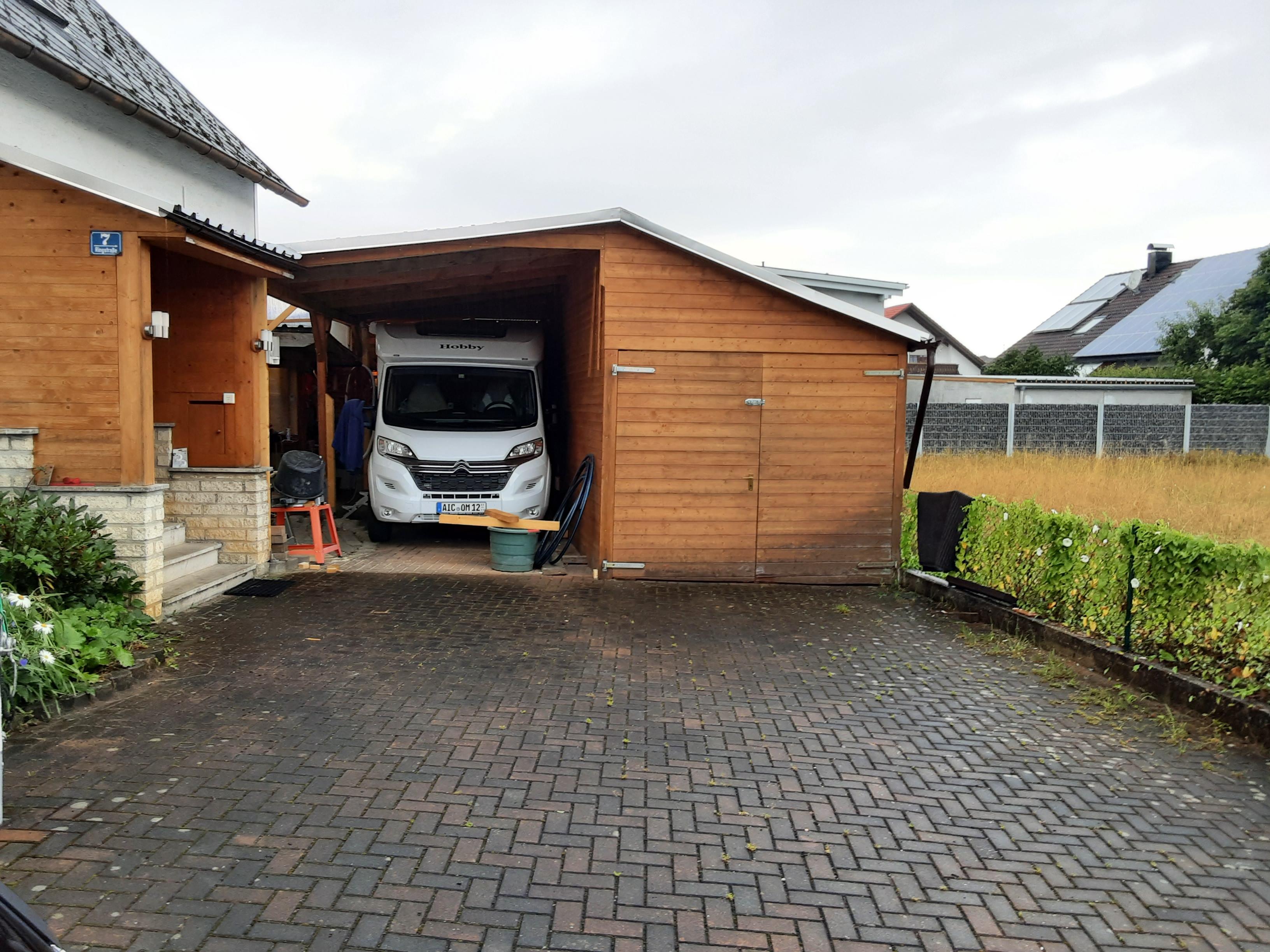 Und wir haben einen Unterstellplatz, der dunkel nur vorne offen ist.