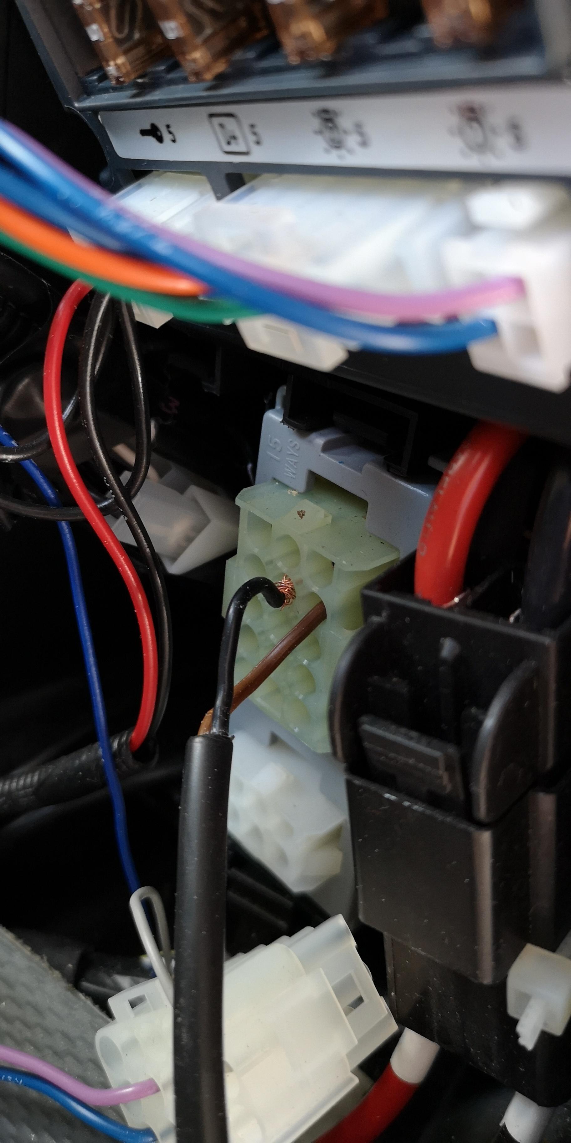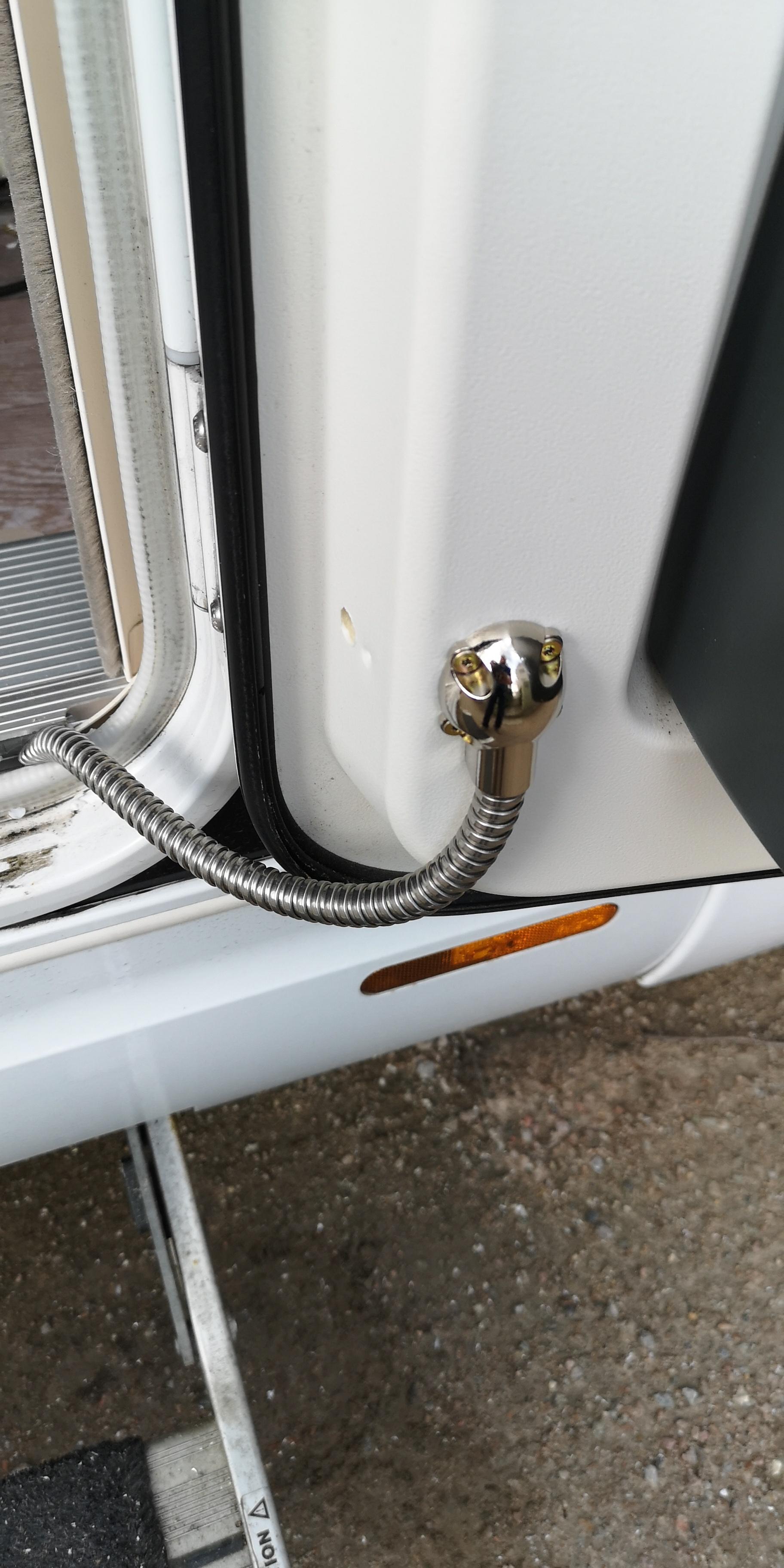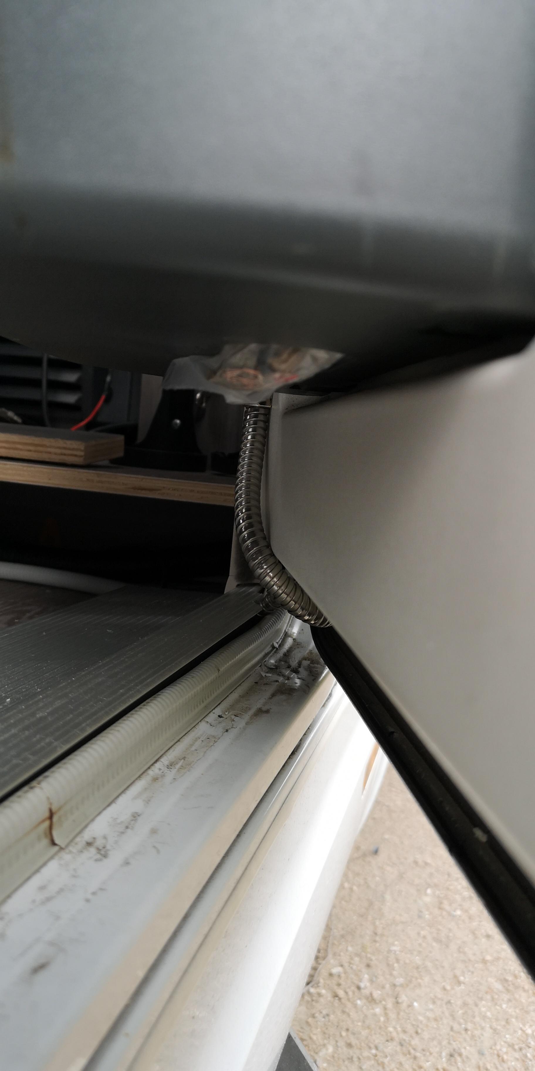Das ist noch der provisorische Anschluss, dank Golfer sind die Kabel jetzt mit den richtigen Pins gecrimpt und im Stecker eingerastet.Der Edelstahl-Kabelschlauch faltet sich beim Schließen der Tür wunderbar zusammen, so wie es sein soll.