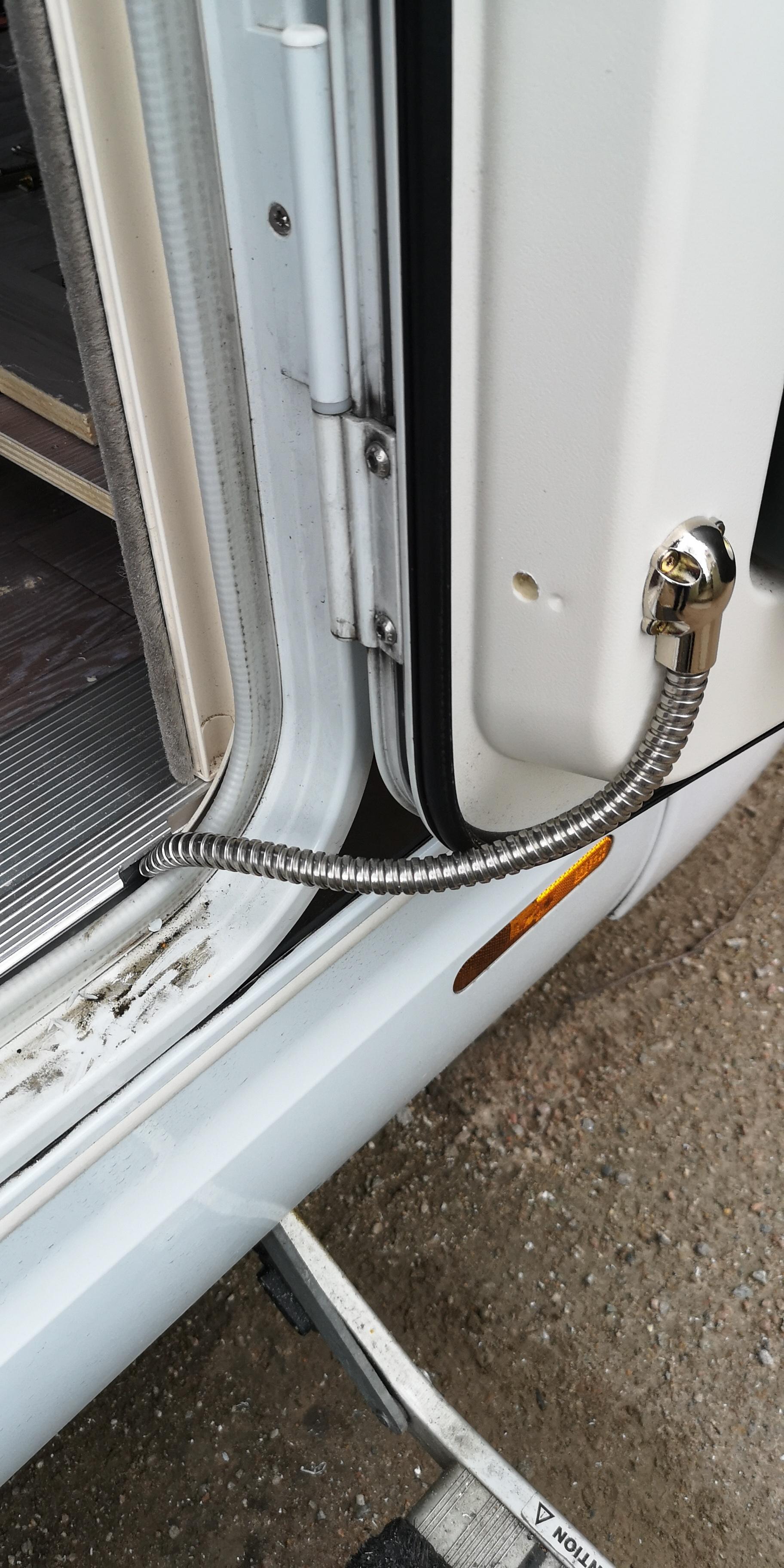 Den Edelstahl-Kabelschlauch habe ich dazu etwas flachgedrückt und zwischen Schwelle und Türrahmen eingeklemmt.