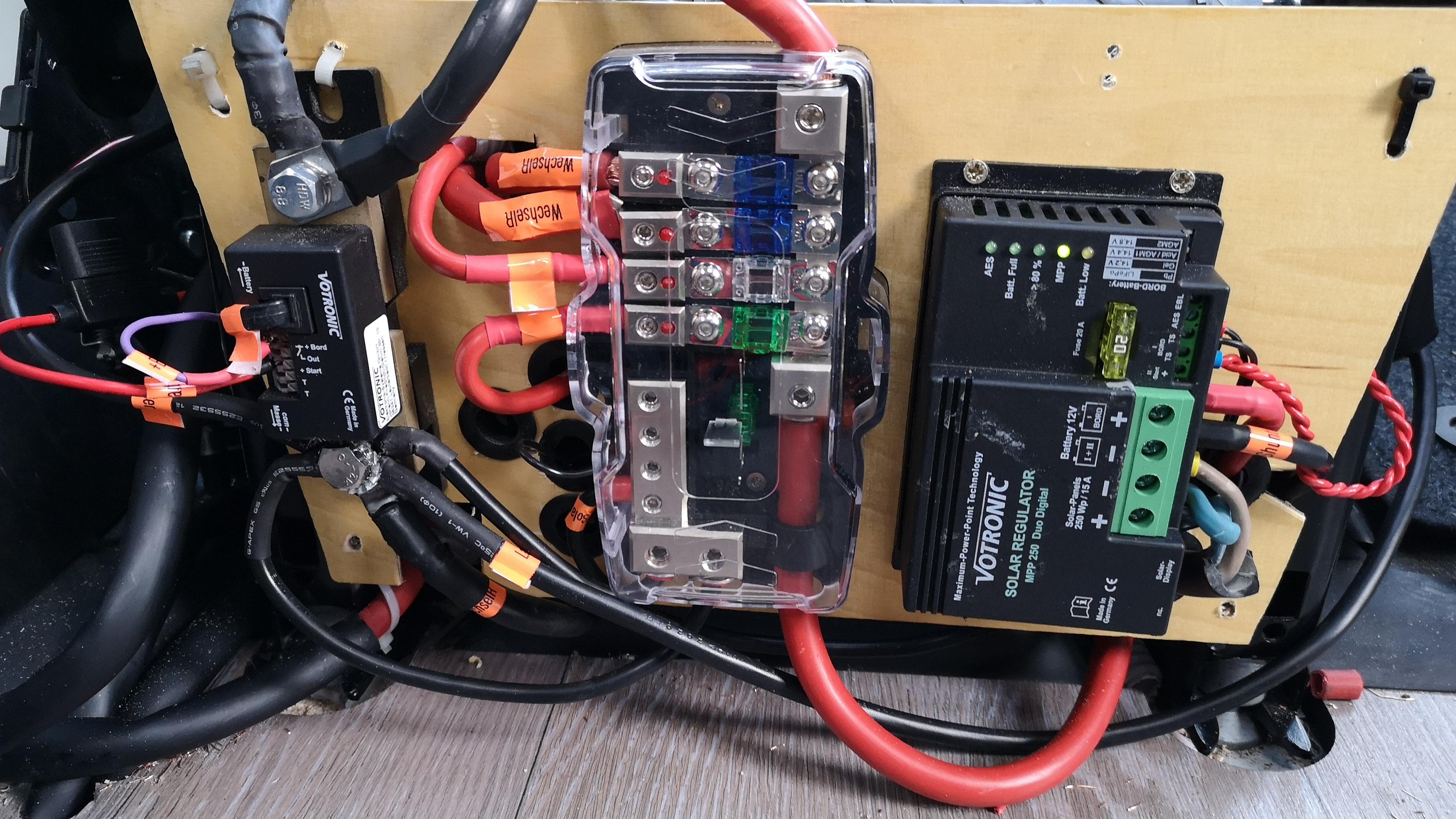 Solarregler, Sicherungsblock, shunt sind hinterm Fahrersitz, 50A-Booster (der ist wesentlich größer als deiner) vorn am Fahrersitz, jeweils hinter den Abdeckungen.