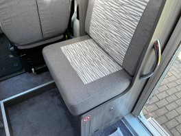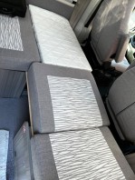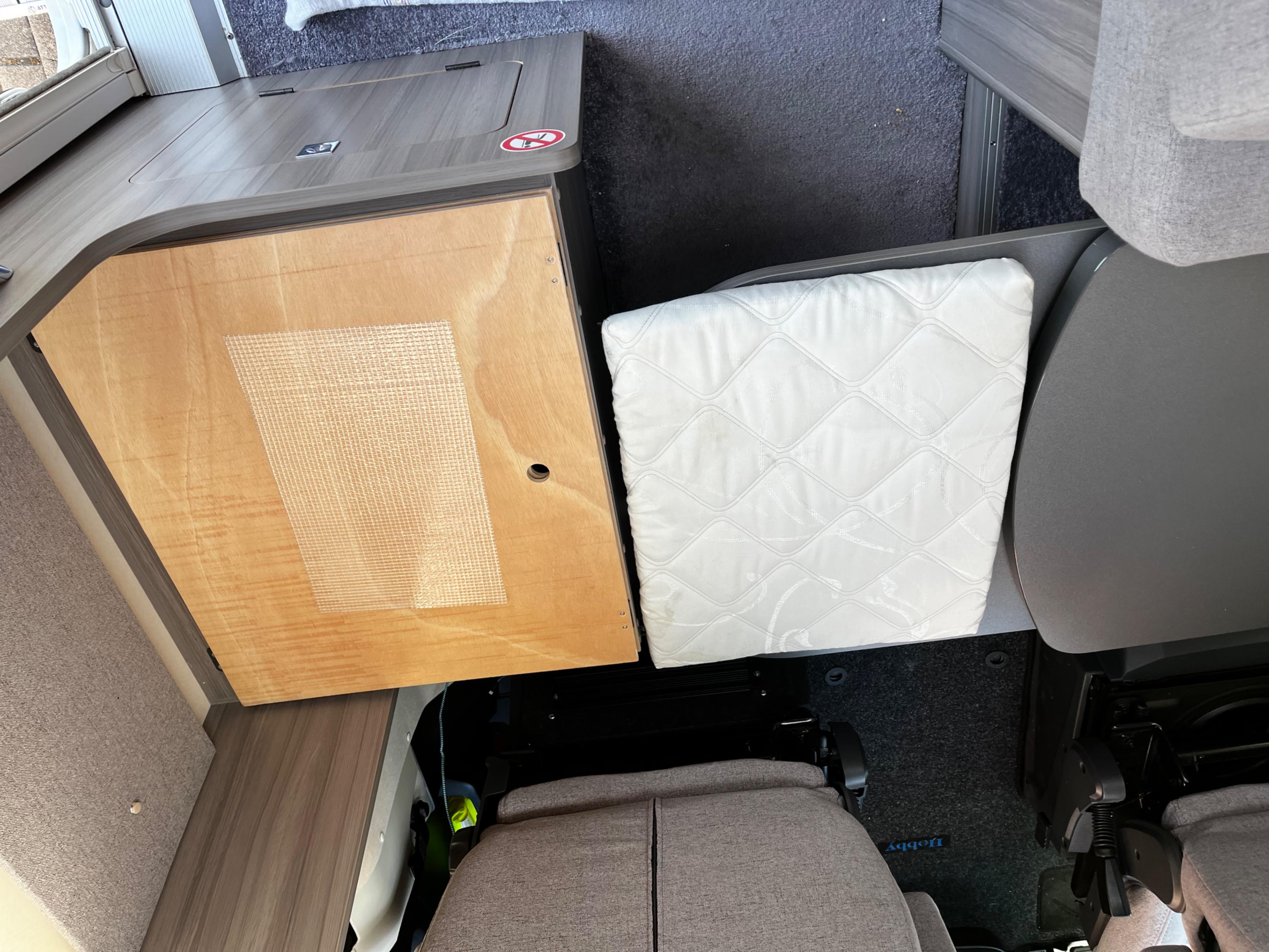 Zum anderen wird vom „Zusatzsitz“ ein Brett (ziemlich dünn) auf den Tisch umgeklappt. Damit der Tisch nicht verkratzt wird, wird ein Polster dazwischen gelegt.