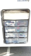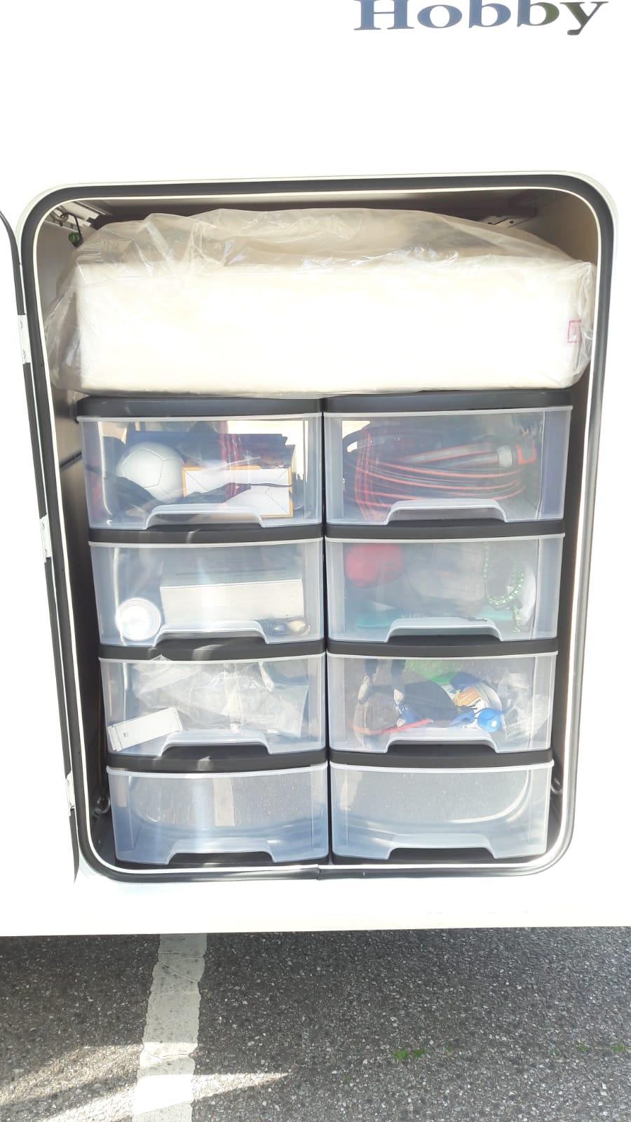 Da ich meine Garage im Womo nicht zum Transport der Fahrräder nutze, die sind mit Träger auf der Anhängerkupplung, habe ich mir diese zwei Kunststoffschränke mit Schubladen reingestellt.(Foto). Sind nicht fest verbaut, sondern nur mit Spanngurt befestigt. Leicht zu händeln und rauszunehmen. Oben drauf ist noch Platz für flache Teile.Preis Euro 19,90 per Stück.