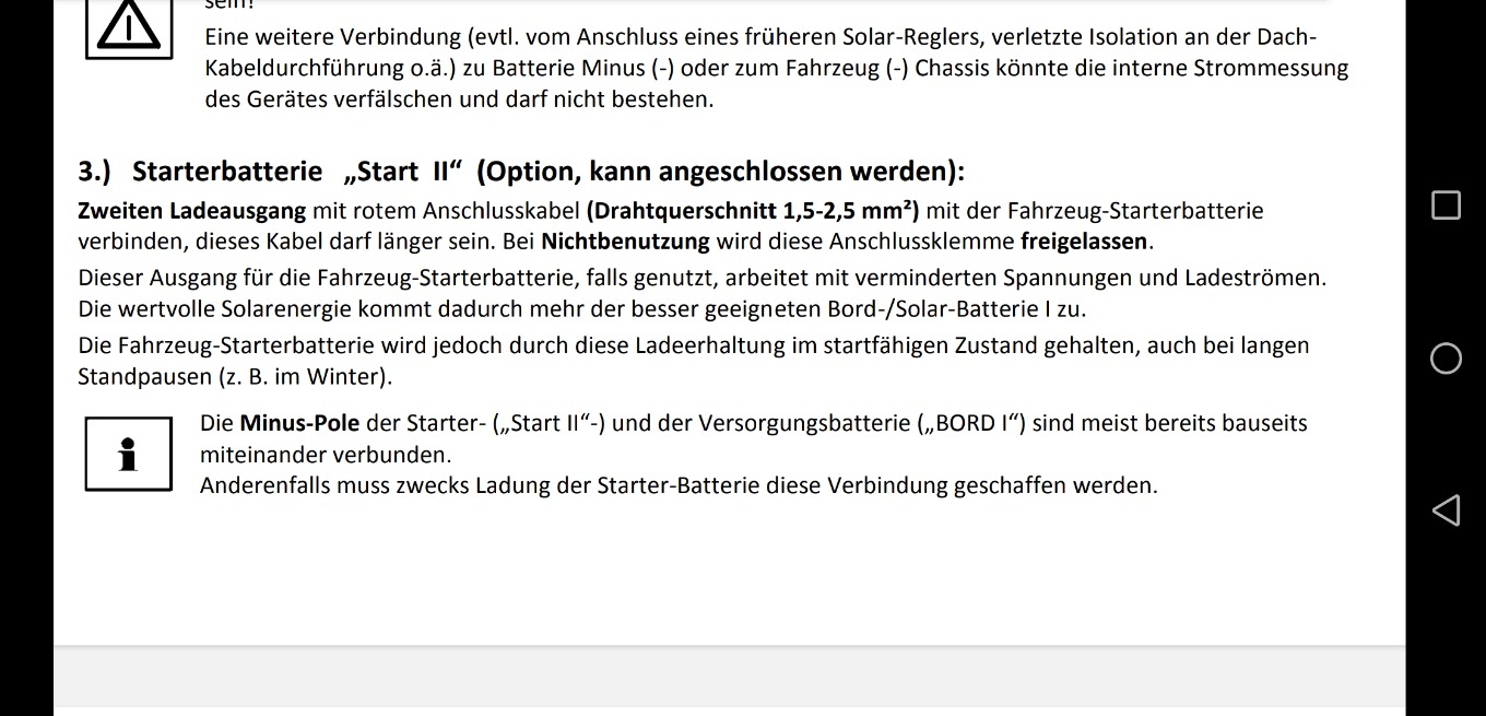Dazu schaue ich mir erst einmal die verbauten Geräte und Ihre Verkabelung an, denn auch ich habe bisher das Problem, dass der Rückladezweig nicht richtig funktioniert.Mein Phaesun MPPT (baugleich mit Votronic) scheint in Sachen Solar und Bordbatterie richtig angeschlossen zu sein (Solar habe ich abgeklemmt). Was mich jedoch wundert, ist, dass die Leitung für die Startbatterie an den Anschluss des Toptron (Batterie 1 - untere Reihe) angeschlossen ist und nicht direkt zur Starterbatterie geht.