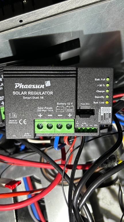 Danach habe ich Landstrom angehängt, das 230V Ladegerät auf GEL gestellt, Batterien angeschlossen und mittels Batterietrennschalter das System wieder hochgefahren.