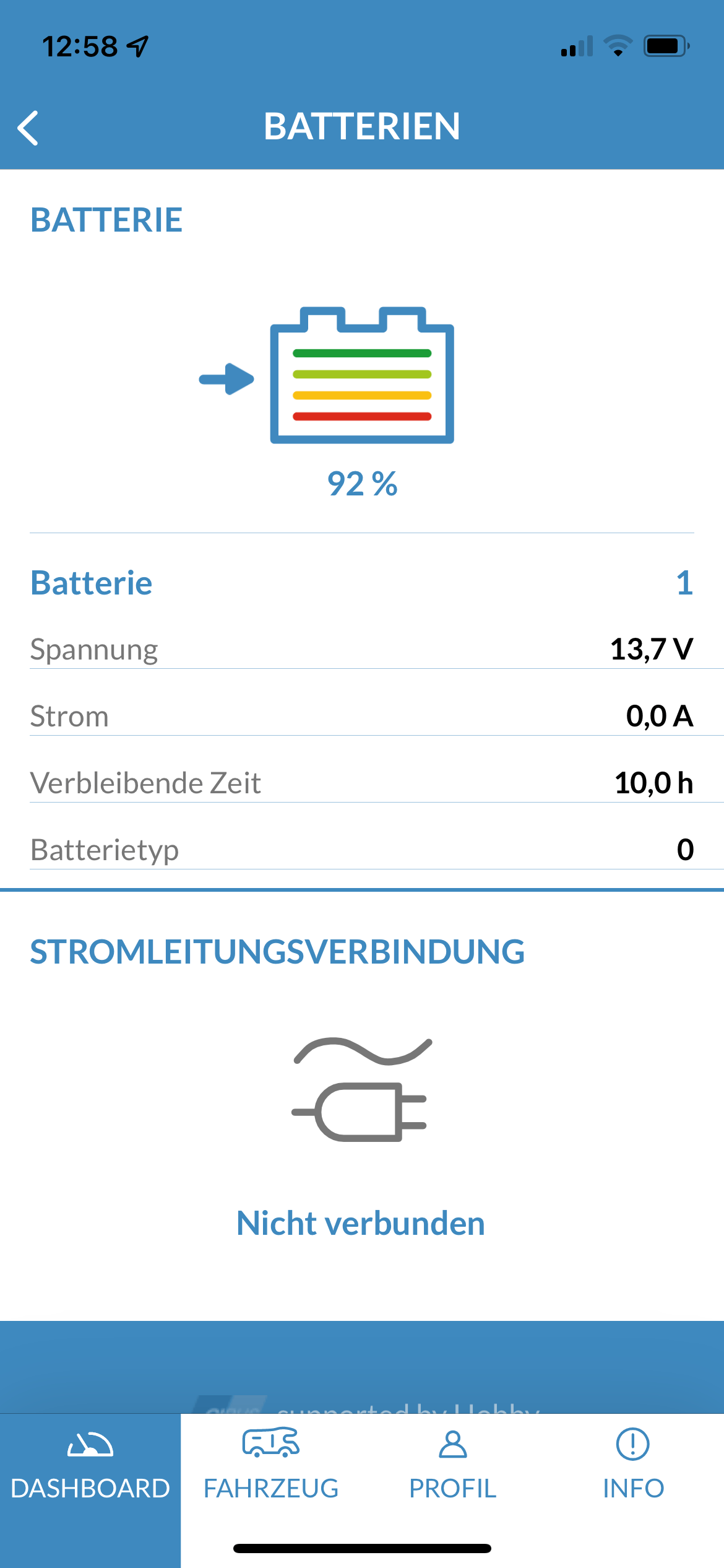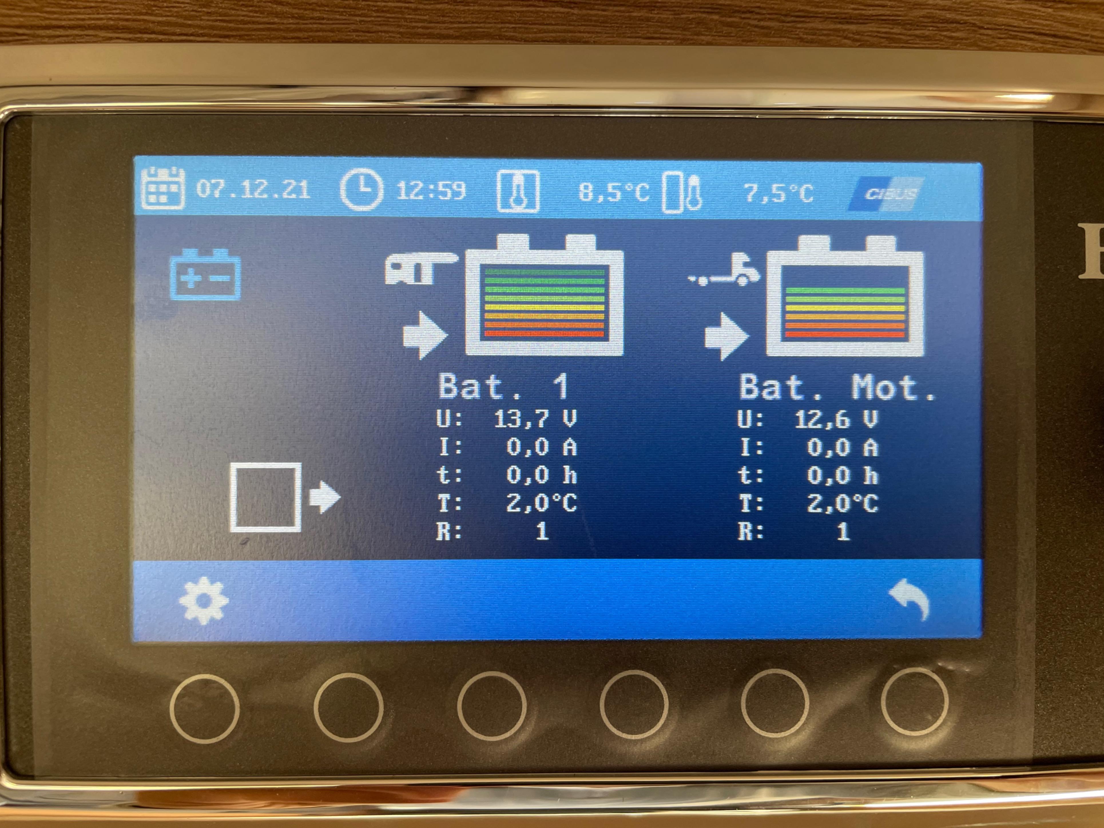 Siehe da: Gegen Mittag waren die Aufbaubatterien jetzt zu 100% voll. Nur die Motorbatterie (wird ja nicht mit geladen, oder?) bleibt bei 75%. -