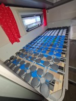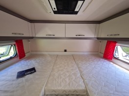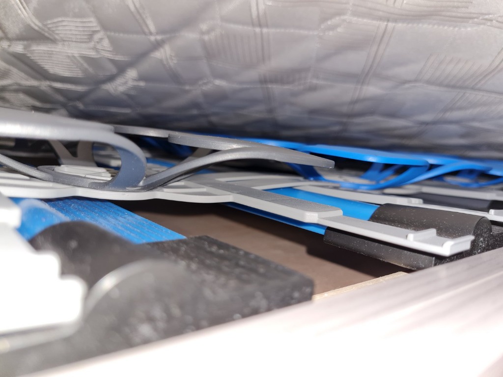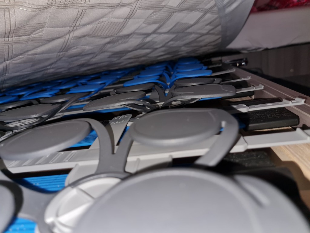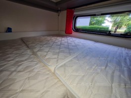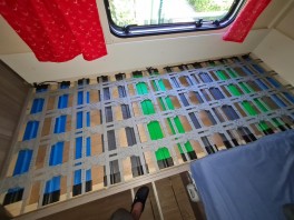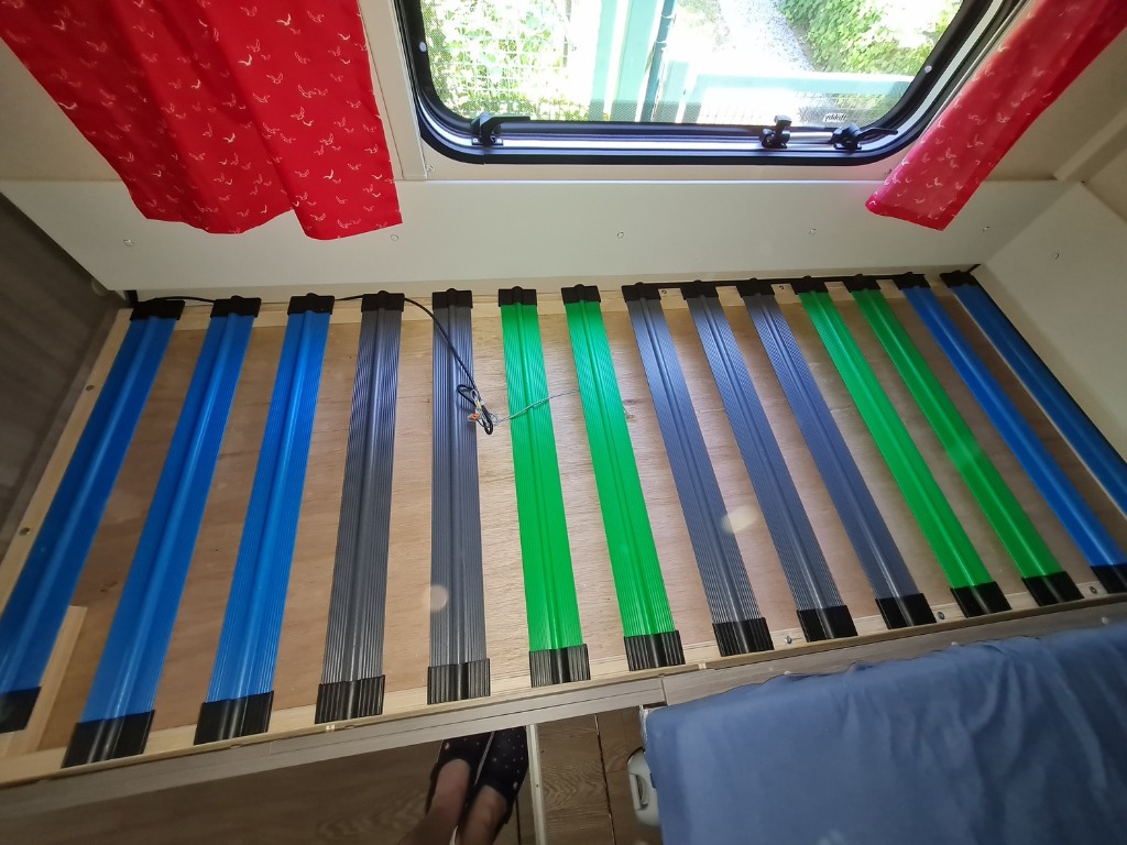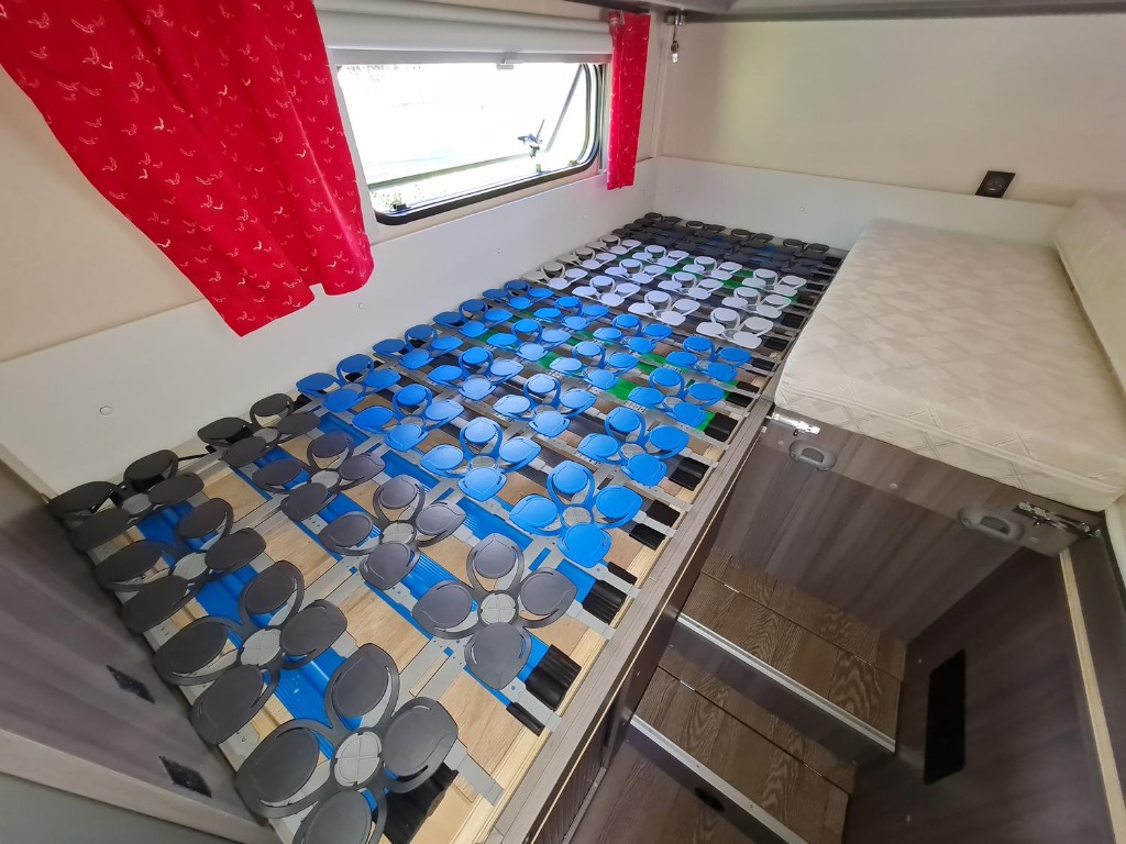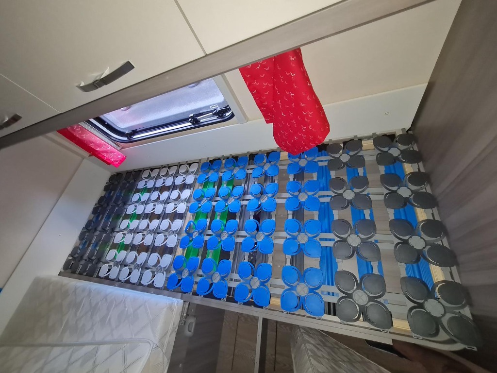 Angelika und ich waren der Meinung, dass trotz Lattenrost die Betten etwas bequemer sein könnten.Wir haben daher auf Empfehlung von Michael das System von CubeCamp eingebaut.Ich habe die Teller-Elemente einfach auf den Lattenrost gelegt.Der Einbau ist unproblematisch (wenn auch Daumen-strapazierend), mit ein bisschen Rumprobieren passen (beim V65GE) die Elemente so perfekt, dass diese nicht gesondert per Verschraubung oder mit Kabelbindern gesichert werden müssen. Auch muss nichts abgeschnitten werden oder so.Das mag aber von Hobby-Modell zu Hobby-Modell unterschiedlich sein.Was wir nicht erwartet hatten: Obwohl von CubeCamp eine Aufbauhöhe von ca. 3,5 cm angegeben werden, hat sich die tatsächliche Aufbauhöhe der Matratzen nicht großartig geändert.Das kann man gut an dem Mittelstück sehen, unter dem das Cubesystem nicht installiert ist und das nicht wirklich viel tiefer liegt.Die Matratzen sind übrigens noch die serienmäßigen.Nach zwei verlängerten Wochenenden zum Testen können wir sagen: der Schlafkomfort hat sich wirklich verbessert, wir schlafen jetzt fast so gut wie zuhause.