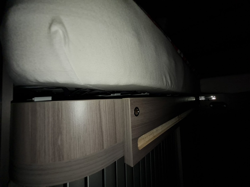 Schöner Nebeneffekt: man muss das Bett nicht mehr hochklappen und kann daher die Gasdruckfeder des Bettes abmontieren, so dass die Hebelwirkung auf die Wand nicht mehr vorhanden ist.