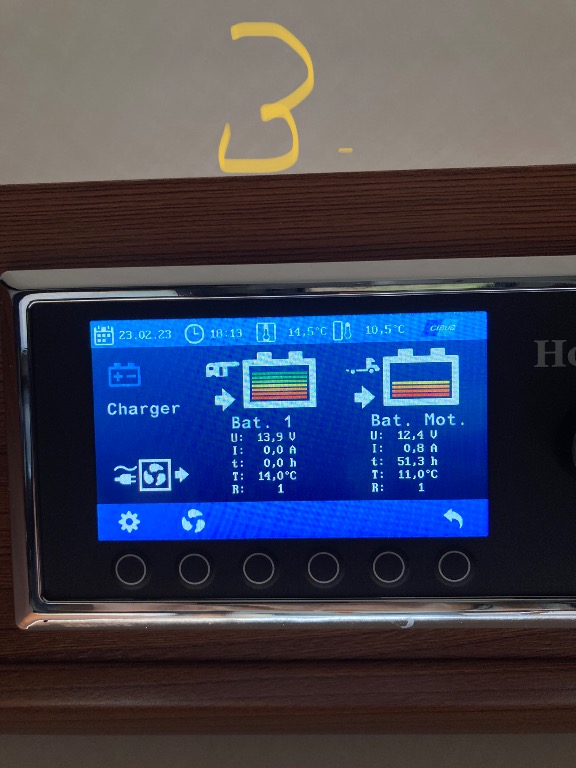 Hallo Kurt, ich habe mein Womo 23.Februar an den Landstrom angeschlossen. Wenn ich den TFT Bildschirm richtig interpretiere, zeigt mir das Display ( Bild 4 ) drei Tage später am 26., dass die Motorbatterie mit 1,1 A geladen wird. Was mich irritiert ist, wenn man sich die Bilder von 1-4 anschaut, dass sich die Balken im Display der Motorbatterie nicht verändert haben, es sind nach wie vor unverändert vier Balken. Wenn doch die Motorbatterie über die Wohnraum Batterie geladen würde, müsste sich doch in den drei Tagen was verändert haben oder interpretiere ich das falsch? Bild 1lädt mit SolarBild 2 direkt nach Anschluss am LandstromBild 34 Stunden später, nach Anschluss LandstromBild 4heute 26.2.Danke und noch einen schönen Restsonntag Liebe Grüße Jürgen