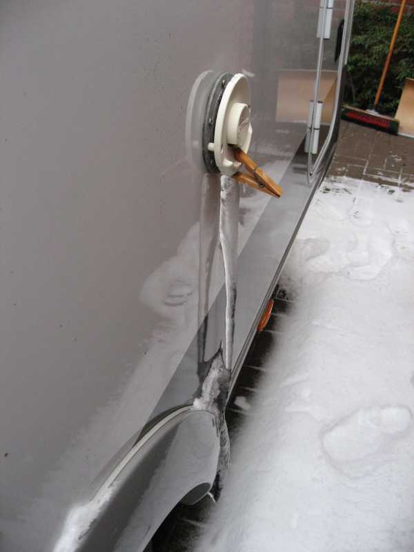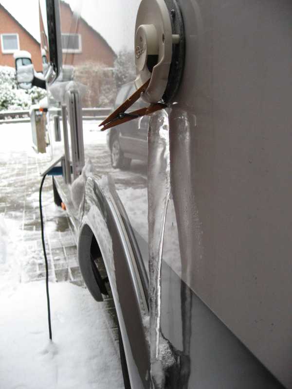 Interessant ist der Eispfropfen, der sich unter dem Abgasaustritt bald bis zum Boden bildet.