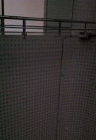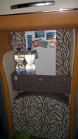 An der hellbraunen Stoffwand befestigte ich einen selbstgebauten Holzkasten und beklebte diesen mit dem dunklen Stoff.