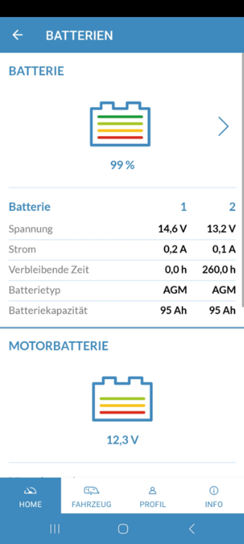 Wir sind jetzt seit 3 Monaten auf Tour und die Anzeige „Verbleibende Zeit“ und „Batteriespannung“ zeigt weiterhin sehr große Unterschiede zwischen den Batterien an.