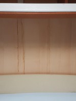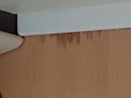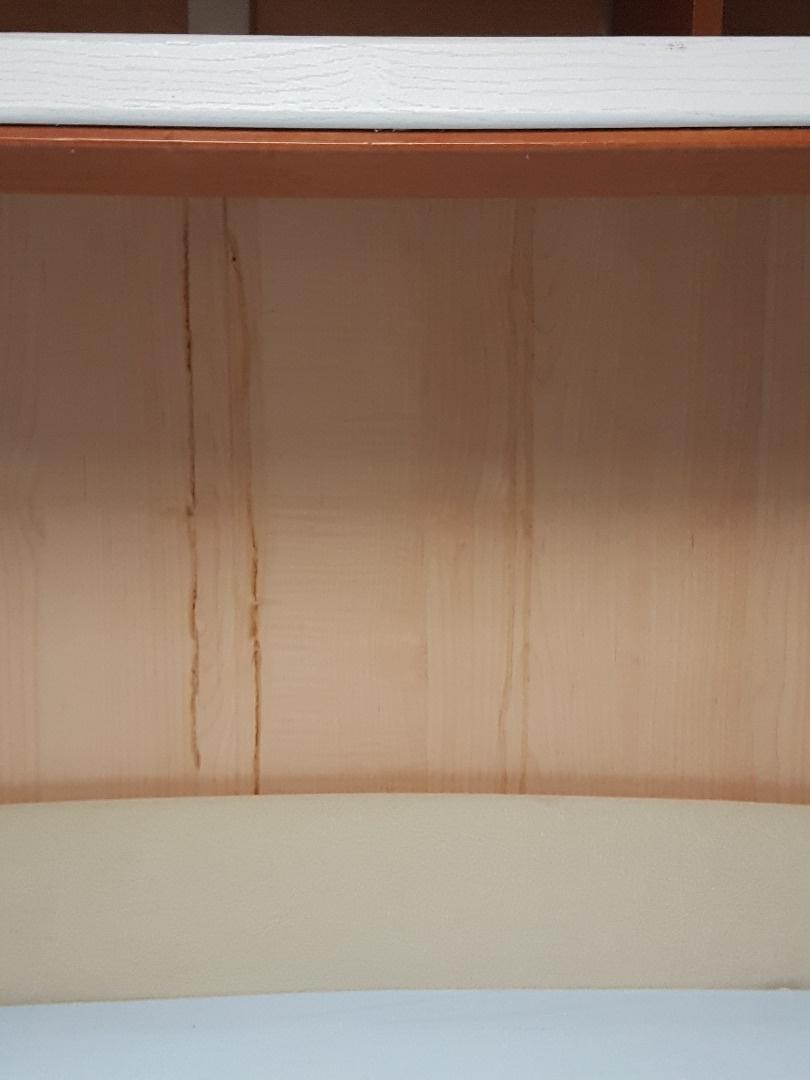 Zum Einen an der Rückwand, genau mittig, fand ich 2 angetrocknete, dunkle Streifen vor, und links oben im Bereich der Seitenwand war es auch unter einer Leiste, die vor knapp 3 Jahren nach einem ähnlichen Schadensbild angebracht worden