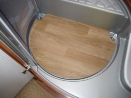 Trotzdem habe ich mir zum Schutz der neuen Duschwanne eine Kunststoffplatte ausgesägt und mit ein Paar Abflußlöchern versehen, so das ich Diese auch beim Duschen drinnen liegen lassen kann.Um Schrammen und Verschmutzung weitestgehenst auszuschliessen habe ich für den "normalen" Gebrauch des WC´s noch einen PVC-Boden zurechtgeschnitten. Hoffentlich hilft´s!!! Anbei ein Paar Bilder: